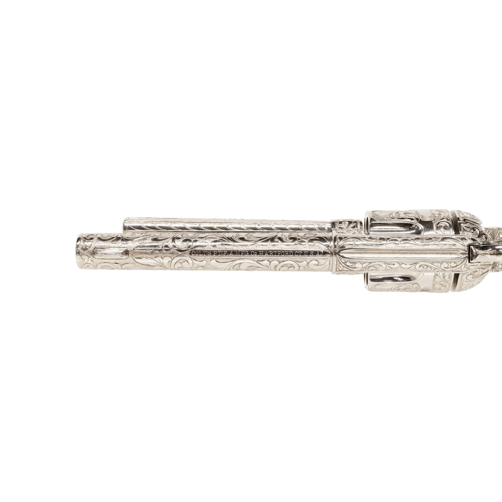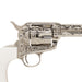 Engraved Colt first generation single action army revolver. Documented Santiago Leis First Generation. 5 1/2" barrel, 41 cal, plastic grip, nickel finish, manufactured 1902. Serial #234597. Manufactured in 1902. With a certificate of authenticity for the engraving work executed by Santiago Leis. Near new condition 95% - 98%, used but little, no noticeable marring of wood or metal, nickel near perfect (some wear at muzzle or sharp edges can be expected). FFL Required.