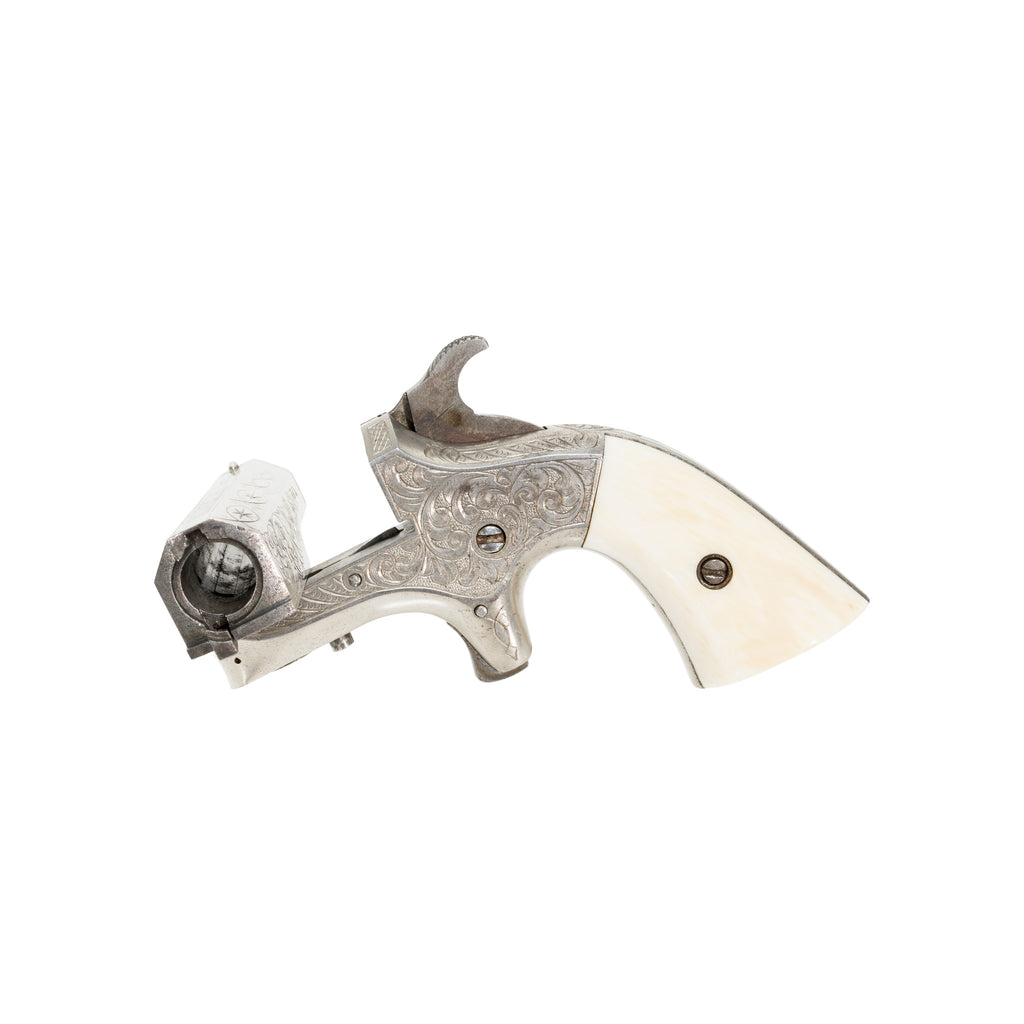Factory engraved Southerner Derringer pistol. Manufactured Brown Manufacturing Co. and Merrimack Arms Company from 1866 to 1873 with a total production of about 16,500. 41 RF, 2 1/2" octagon barrel with nickel finish and antique ivory grips. Serial #3413.