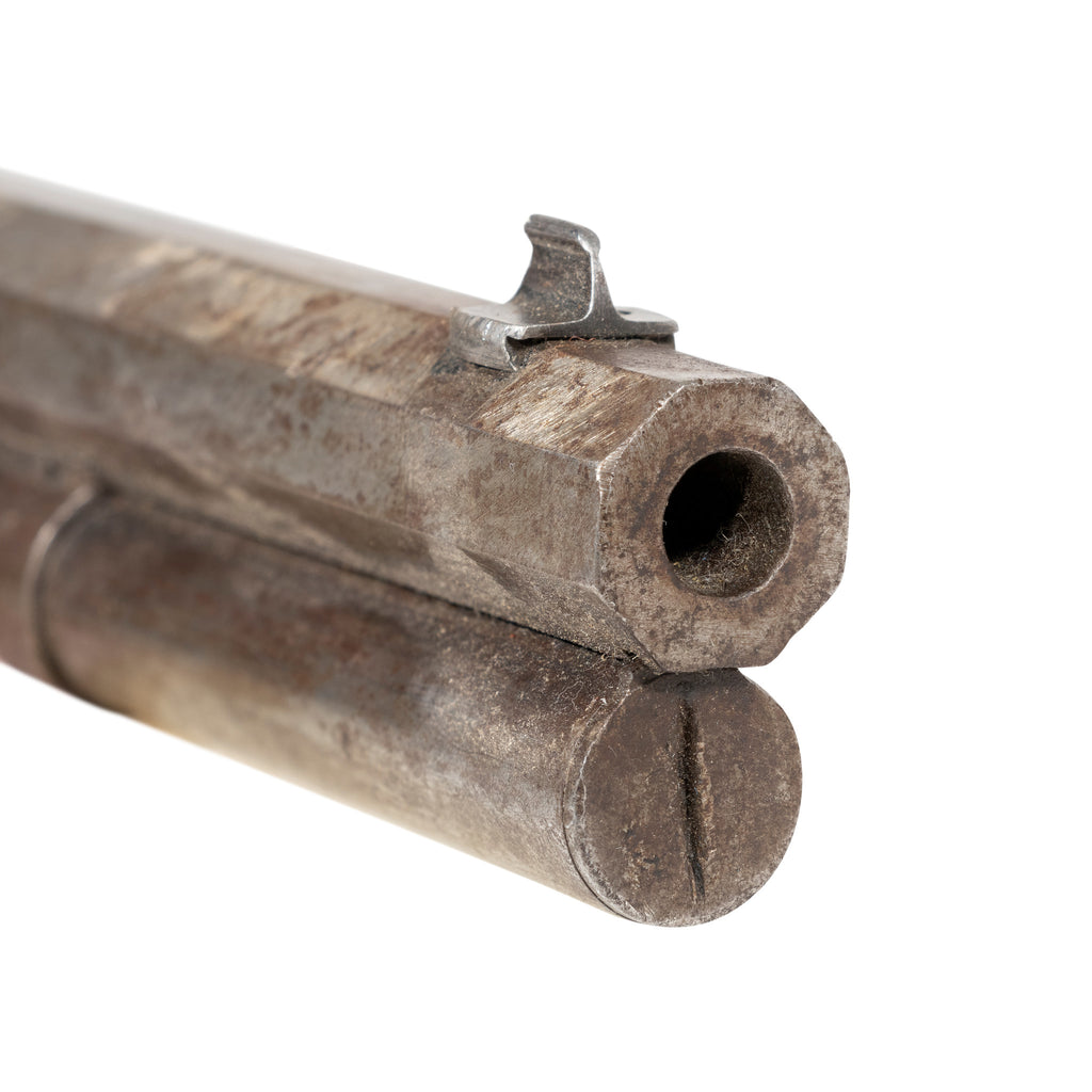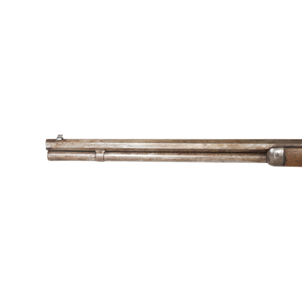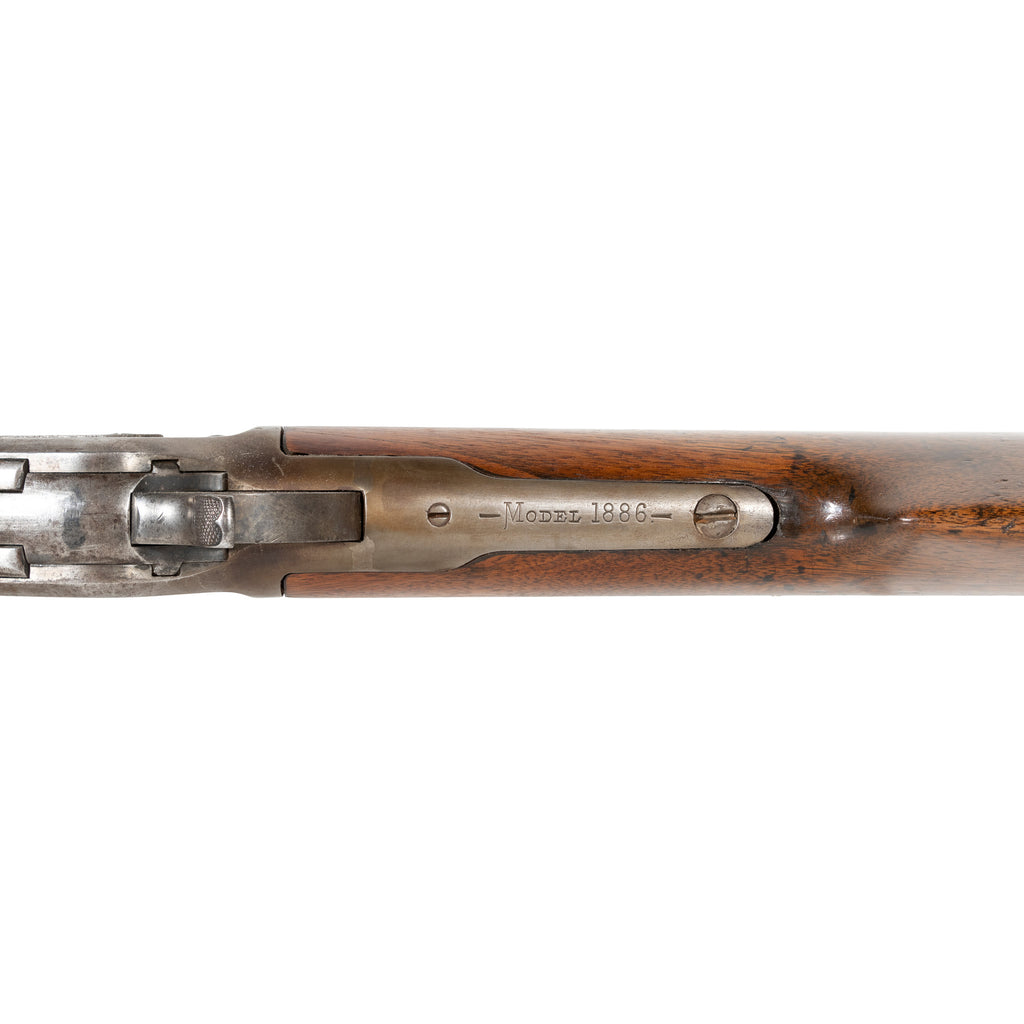 Winchester Model 1886 lever action rifle. Extra lightweight standard sporting version in .38-56 WCF. 26” octagon barrel. The finish on the barrel shows signs of an attempted restoration. Rifling is visible with possible light pitting. Stock has great pat