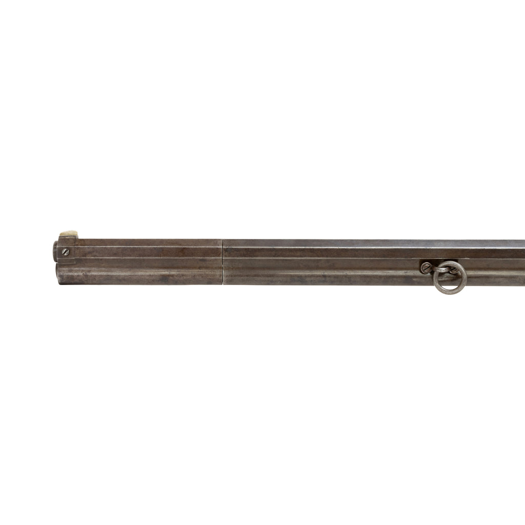 New Haven Arms Model 1860 Henry lever Action rifle. 24" barrel, .44 caliber, model 1860, serial #10428. Manufactured circa 1865 at the close of the Civil War, the Henry's popularity expanded beyond the battlefield into the burgeoning Western frontier. The standard blued octagon barrel of this example is stamped on the top flat with the correct large size 2-line address. Fitted with tapered German silver blade front sight and late 900 yard graduated ladder rear sight with retaining screw. Full length magazine tube with large brass follower and forward sling bar with ring. Iconic later contour brass frame stamped on the lower tang with Oliver Winchester's "W" inspection stamp. Walnut stock of late form with a mildly obtuse comb angle. Matching serial number stamped in the stock channel. Fitted with an iron sling swivel and brass tool trap crescent butt plate, the matching serial number stamped on the underside. CONDITION: Very Good. Barrel has drifted to an overall plum brown patina with some older oxidation spotting. Frame has a very pleasant mellow mustard patina with a few areas of darkness. Stock has been lightly cleaned, a few impressions and other bruises remaining. Very strong, well defined bore with frosting and other imperfections. Fine mechanics.