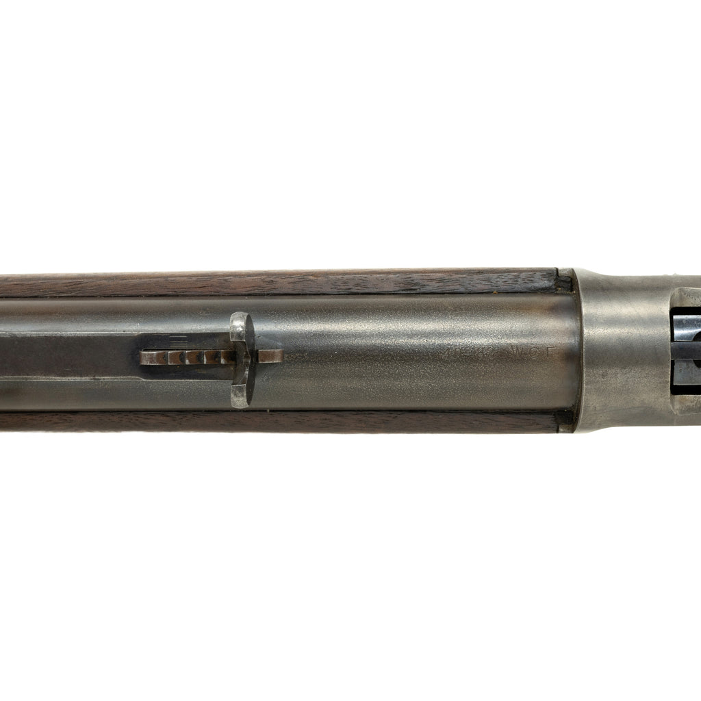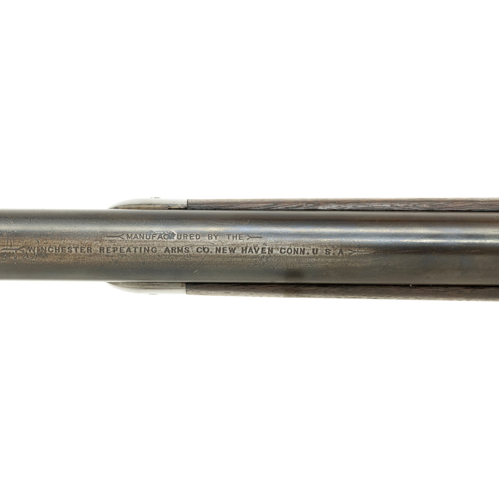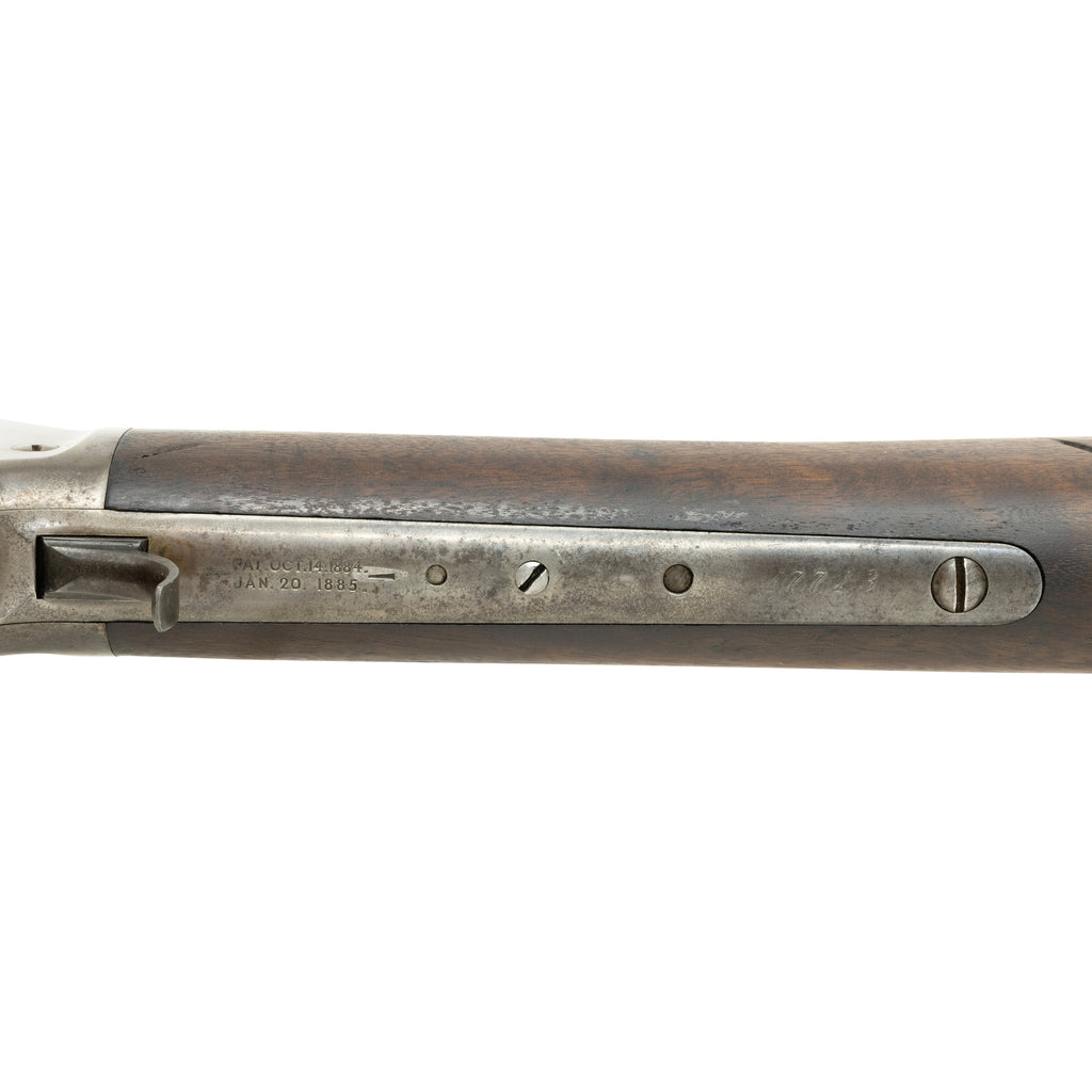Antique Winchester 1886 lever action rifle, 40-82 WCF. 26" round barrel, blue/case hardened, walnut stock, serial #17713. Manufactured 1888. Bore is mostly bright with some strong rifling and light pitting. Very good condition, retaining some of the original finishes in protected regions with the balance thinned to a mostly brown patina along with a replacement bolt, some light edge silvering, scattered minor patches of spotting/freckling, and scattered minor handling marks. The furniture is fine as sanded and re-oiled with some light compression marks. Mechanically excellent.