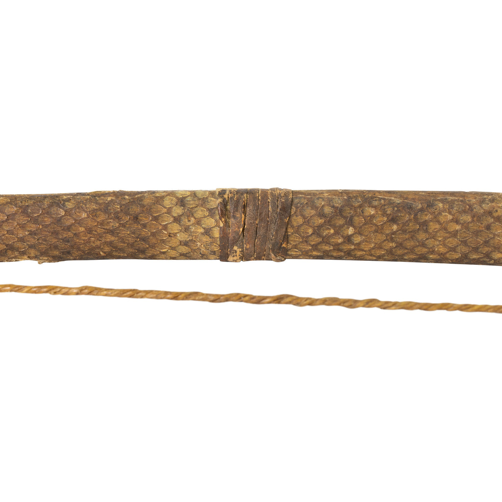 Apache bow and quiver case made of mountain lion hide. A little hair still remains. Vibrant paint. Bow is covered with rattlesnake skin and has four original arrows with steel points. Bow 40" Quiver Case 25" Points 3". Ex. Forrest Fenn.