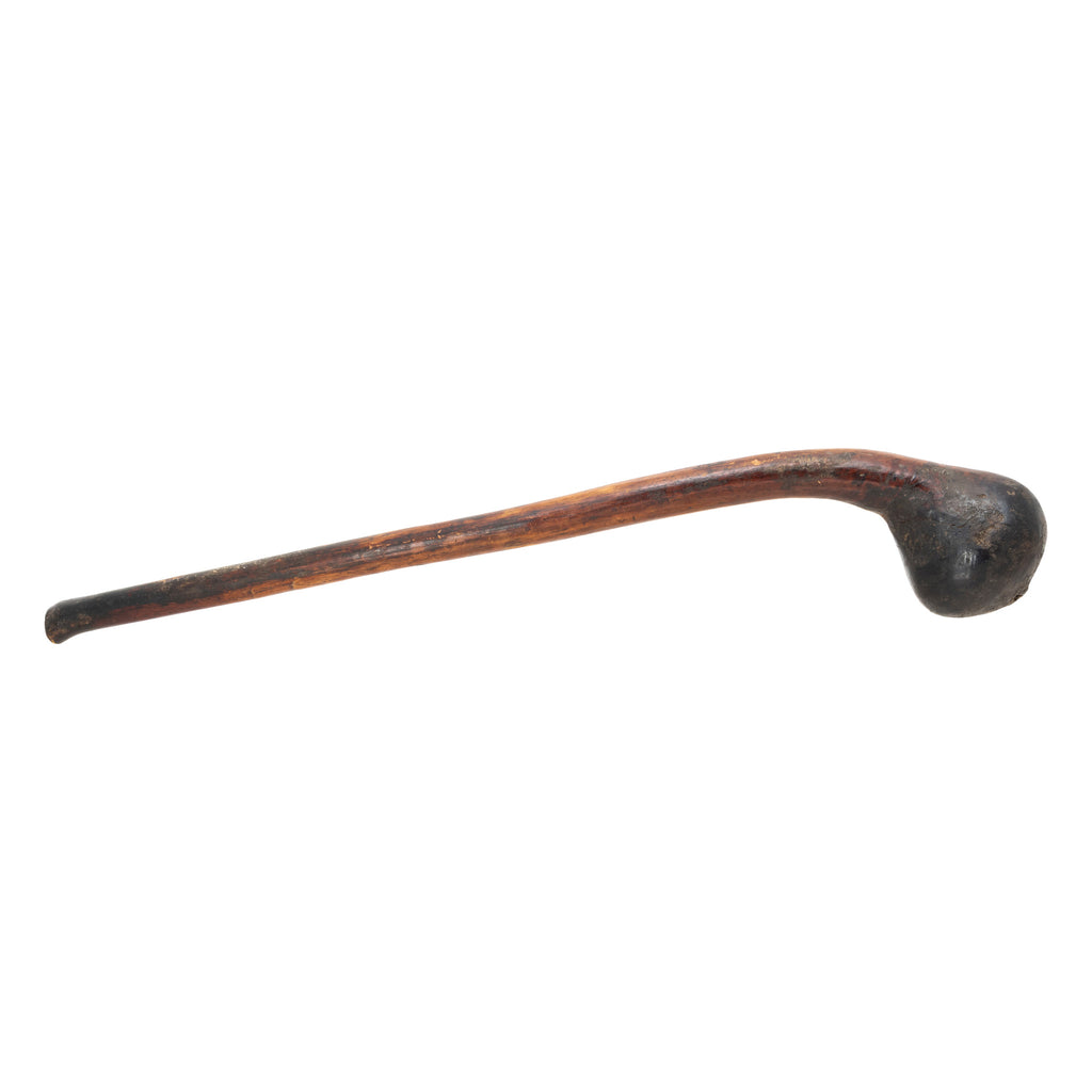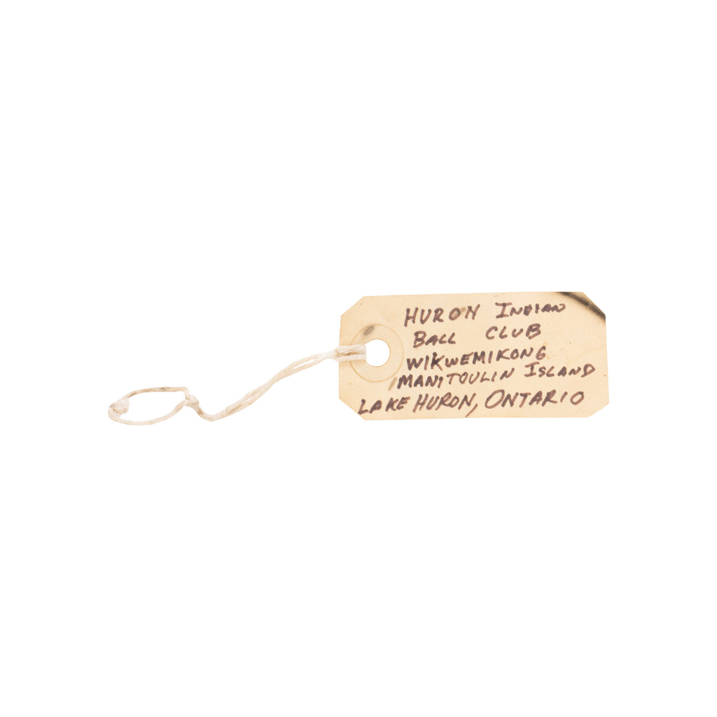 18th Century Huron ball club with old tag "Heron Indian Ball Club Wikwemikon Mantioulin Island, Lake Huron, Ontario." Made of osage orange with fire hardened burl ball head. Much patina.