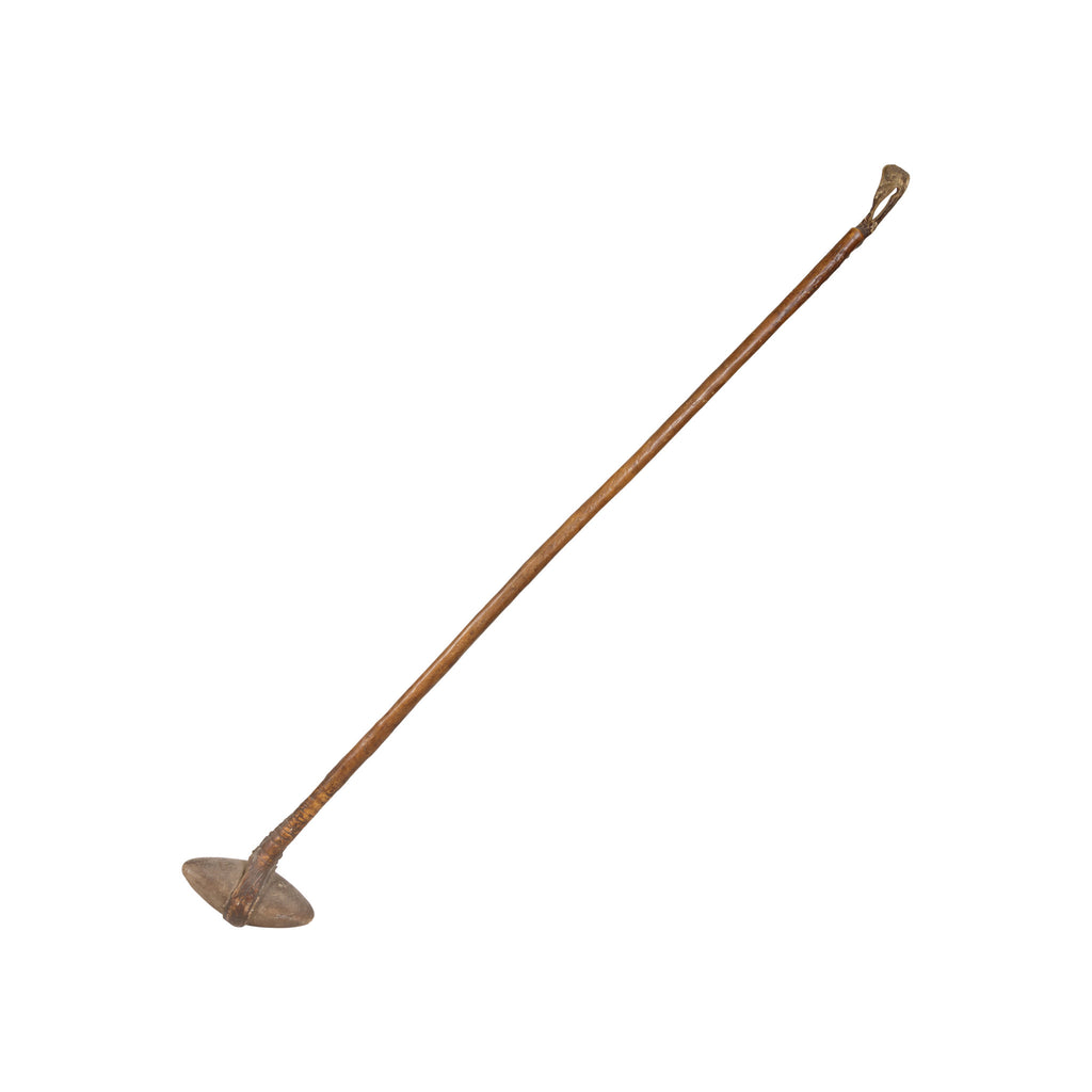 Northern Plains war club with doubled pointed stone head. Collected in Iowa. Appears to have hit someone very hard for the last time. Rawhide wrapped handle, great golden patina from sweat and grease.