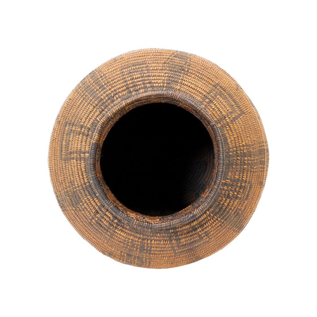 Apache figurative olla basket having figural decoration and golden patina. Eleven Apache Ganz dancers with wands. 14"H x 10"D