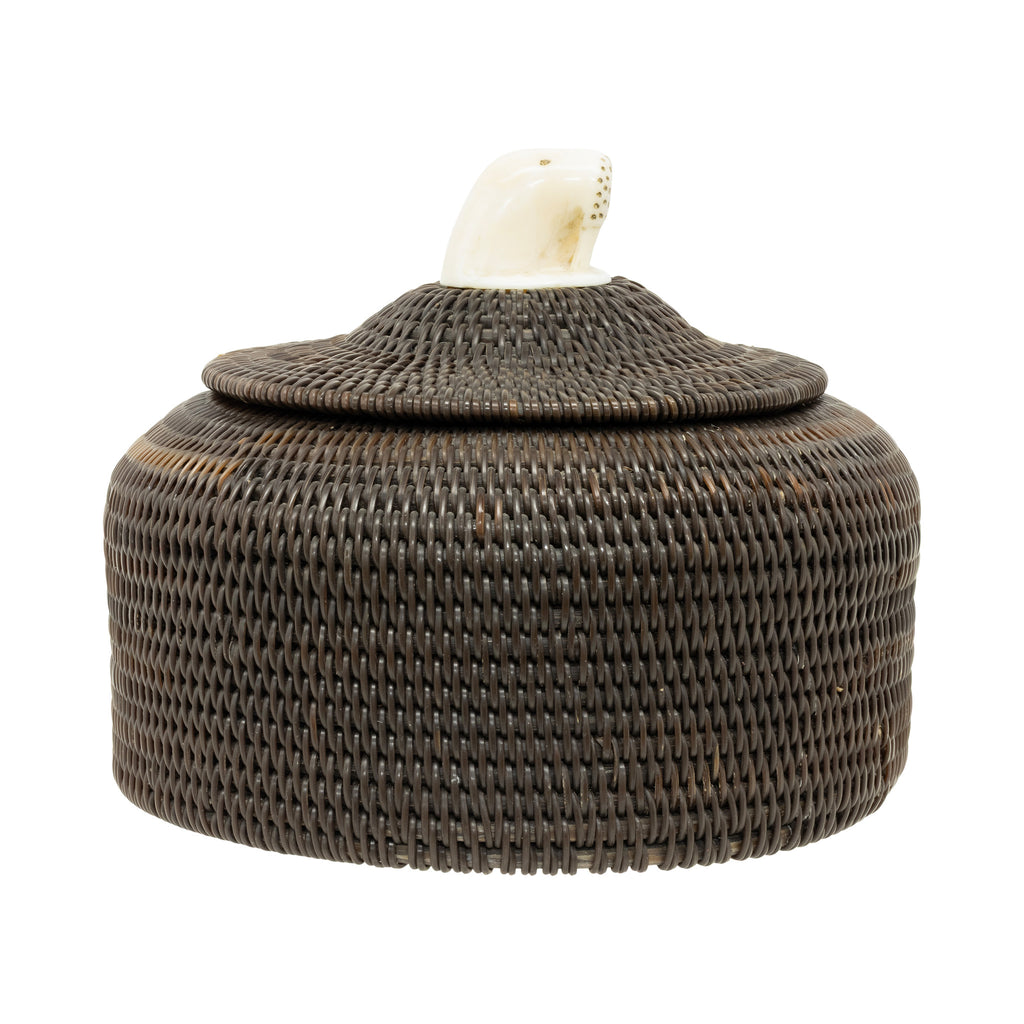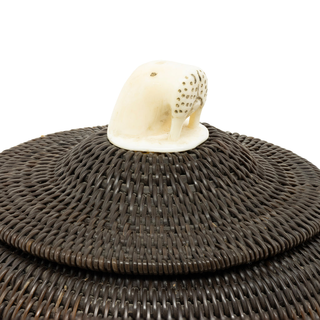 Very finely woven baleen basket with walrus head finial. Signed on interior base "Tooyak/Wainwright, BAS-766" for Adam Tooyak (1927-). 4 1/2"D x 3 1/2"H top of finial. Baleen is a material obtained by Inupiaq and St. Lawrence islanders from harvested whales, particularly the bowhead. For over half a century, Alaskan Inupiaq Eskimos have created baskets from baleen, a keratinous substance from the mouths of plankton-eating whales. Although not as prevalent as ivory, baleen basketry significantly supports the livelihoods of weavers in arctic villages in Alaska. Collectors of Alaskan Native art highly seek these baskets, with contemporary weavers producing beautifully shaped, finely woven pieces, some featuring multicolored baleen. Today, there are only a handful of people who weave baleen baskets and in limited areas. Most baskets are twined. The baleen is stripped, soaked in water and then woven. Typically, weavers start these round baskets with an ivory disc at the bottom, which has holes around its periphery. They then finish the top with an ivory or bone ornamenting the lid, often adorned with finial figures. Only Alaskan Natives are allowed to harvest and use baleen.