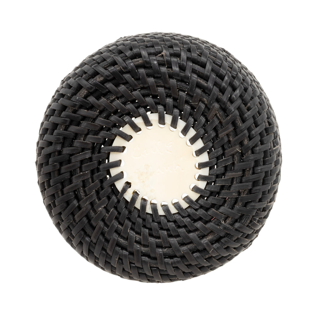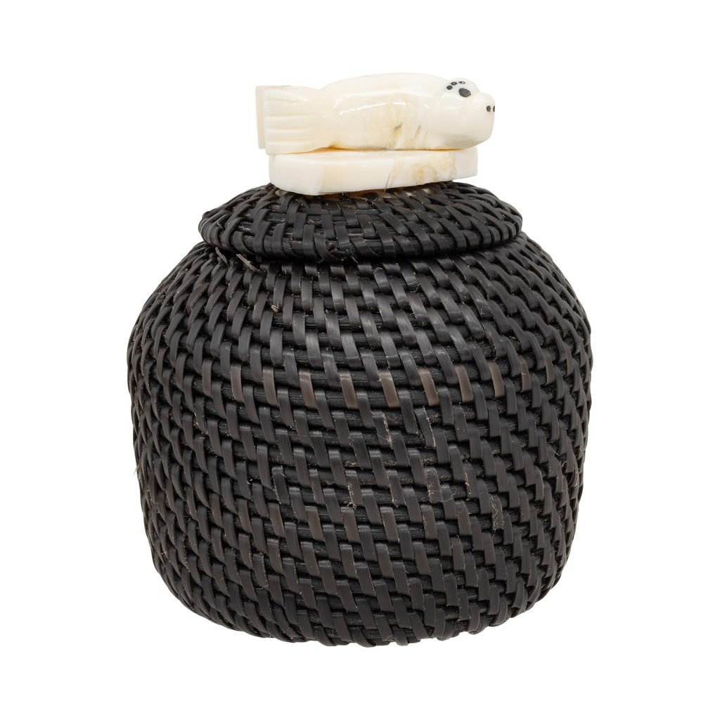 Baleen basket with walrus ivory sleeping seal finial on ice pack. Bottom signed Carl E. Hank. 2 ½”D x 3 ½”H top of finial. Carl Hank, Inupiaq, is a baleen basket maker born and residing in Anchorage, Alaska. The story of baleen basketry as an art form that cannot be told without the Hank family. For generations they have kept this unique and laborious weaving tradition alive. Carl is the great-grandson of master weavers Carl and Eunice Hank. His uncle is noted weaver Harry Hank. Carl continues to develop his skills and style and is gaining a reputation as one of the most accomplished baleen basket weavers working today. Baleen is a material obtained by Inupiaq and St. Lawrence islanders from harvested whales, particularly the bowhead. For over half a century, Alaskan Inupiaq Eskimos have created baskets from baleen, a keratinous substance from the mouths of plankton-eating whales. Although not as prevalent as ivory, baleen basketry significantly supports the livelihoods of weavers in arctic villages in Alaska. Collectors of Alaskan Native art highly seek these baskets, with contemporary weavers producing beautifully shaped, finely woven pieces, some featuring multicolored baleen. Today, there are only a handful of people who weave baleen baskets and in limited areas. Most baskets are twined. The baleen is stripped, soaked in water and then woven. Typically, weavers start these round baskets with an ivory disc at the bottom, which has holes around its periphery. They then finish the top with an ivory or bone ornamenting the lid, often adorned with finial figures. Only Alaskan Natives are allowed to harvest and use baleen.