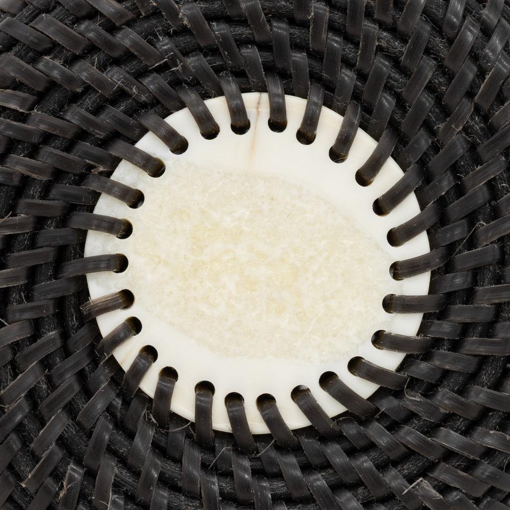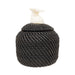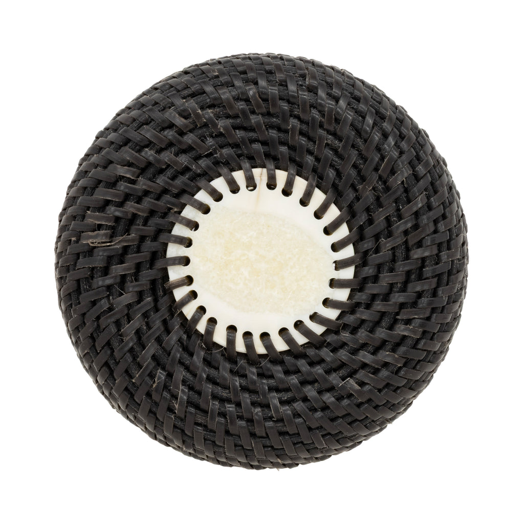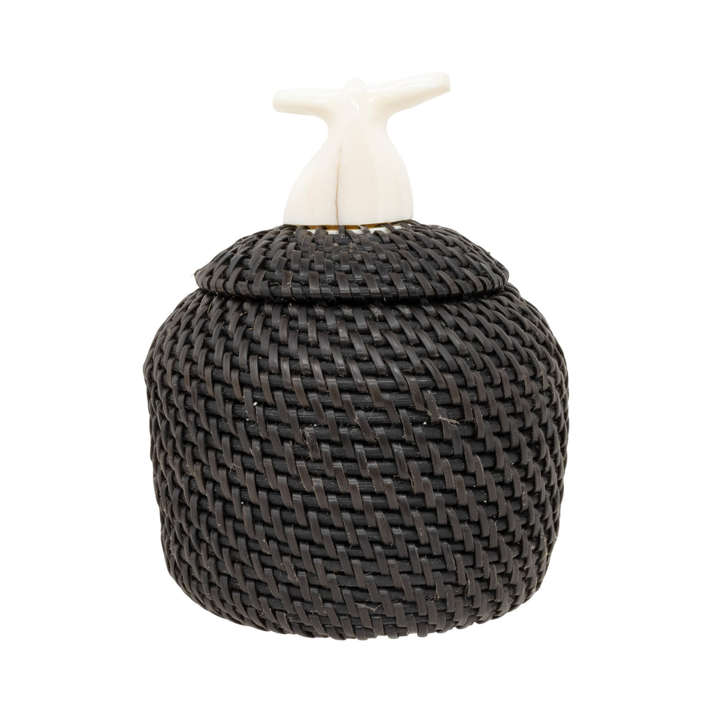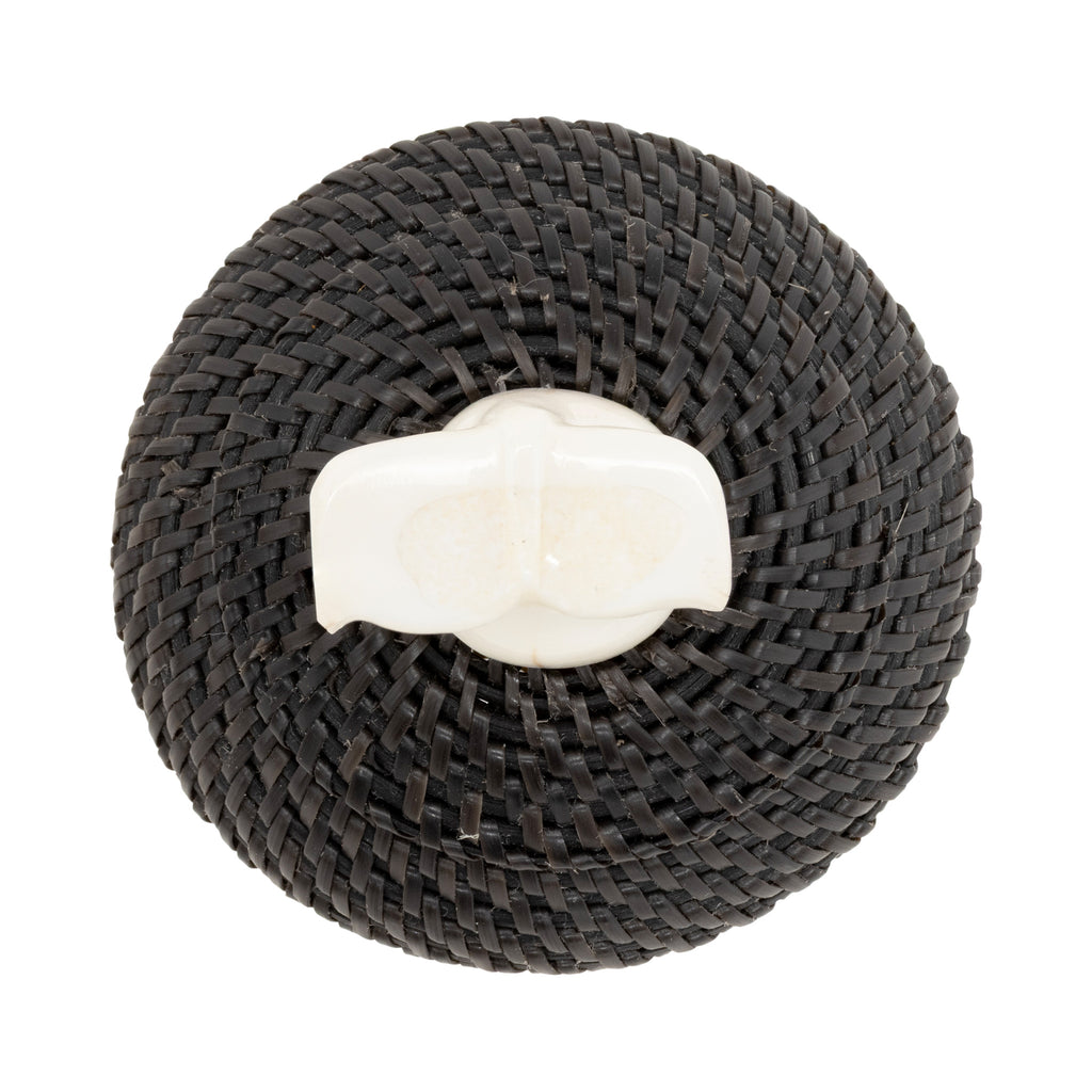 Baleen basket with walrus ivory whale flippers finial. Bottom signed Carl E. Hank. 3 ¼”D x 4 ½”H top of finial. Carl Hank, Inupiaq, is a baleen basket maker born and residing in Anchorage, Alaska. The story of baleen basketry as an art form that cannot be told without the Hank family. For generations they have kept this unique and laborious weaving tradition alive. Carl is the great-grandson of master weavers Carl and Eunice Hank. His uncle is noted weaver Harry Hank. Carl continues to develop his skills and style and is gaining a reputation as one of the most accomplished baleen basket weavers working today. Baleen is a material obtained by Inupiaq and St. Lawrence islanders from harvested whales, particularly the bowhead. For over half a century, Alaskan Inupiaq Eskimos have created baskets from baleen, a keratinous substance from the mouths of plankton-eating whales. Although not as prevalent as ivory, baleen basketry significantly supports the livelihoods of weavers in arctic villages in Alaska. Collectors of Alaskan Native art highly seek these baskets, with contemporary weavers producing beautifully shaped, finely woven pieces, some featuring multicolored baleen. Today, there are only a handful of people who weave baleen baskets and in limited areas. Most baskets are twined. The baleen is stripped, soaked in water and then woven. Typically, weavers start these round baskets with an ivory disc at the bottom, which has holes around its periphery. They then finish the top with an ivory or bone ornamenting the lid, often adorned with finial figures. Only Alaskan Natives are allowed to harvest and use baleen