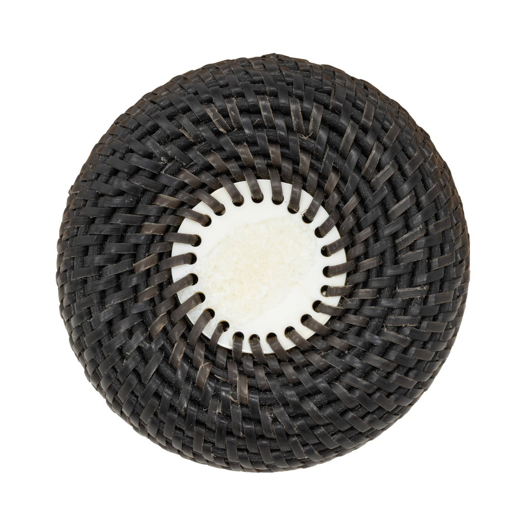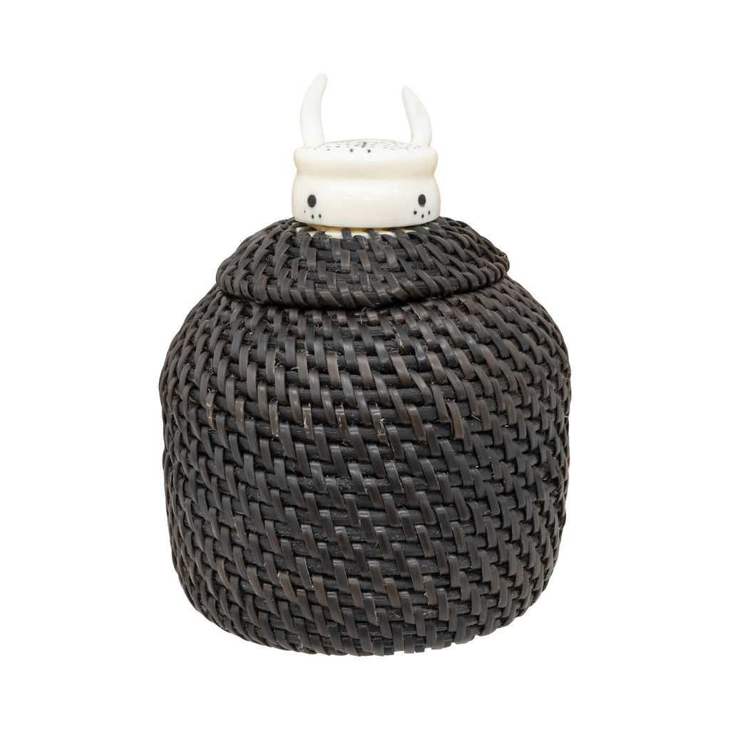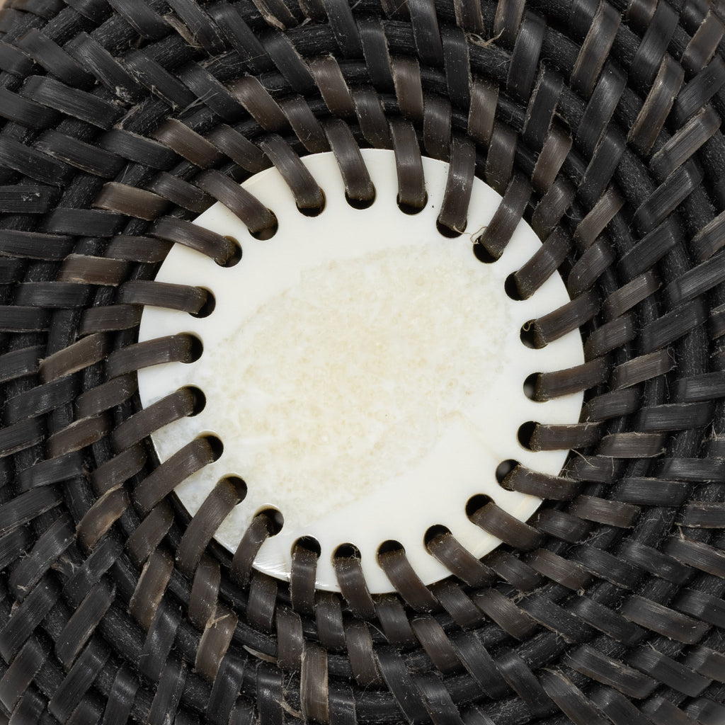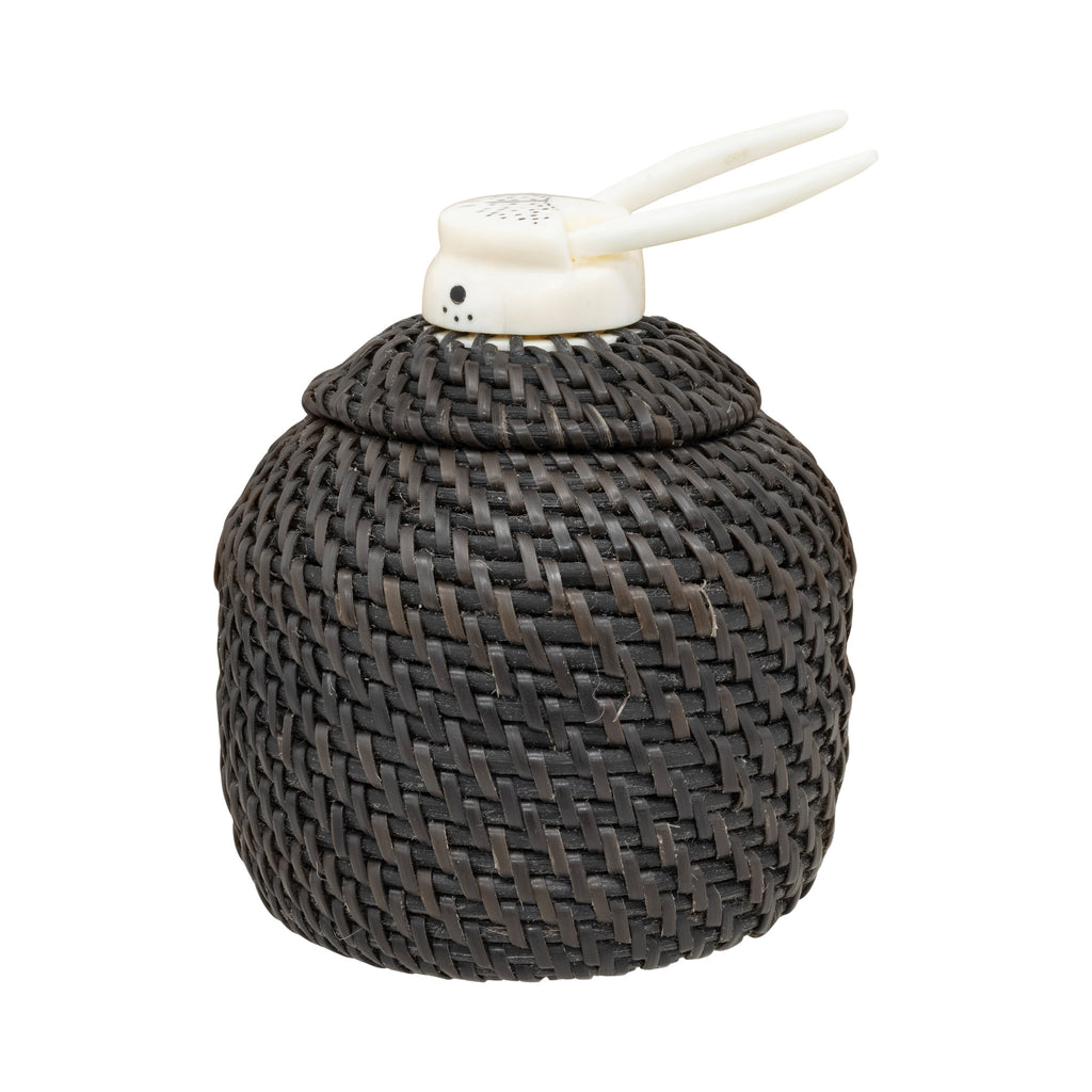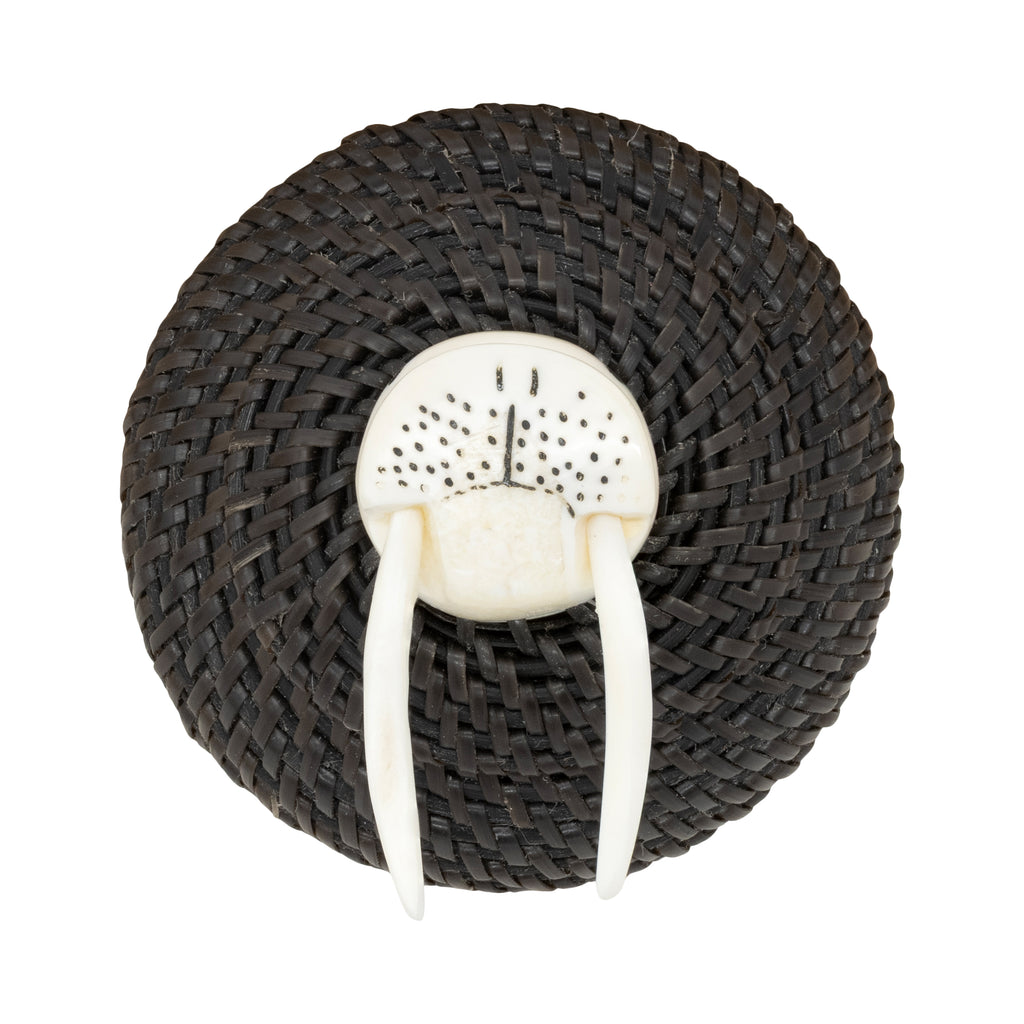 Baleen basket with walrus ivory bull walrus head finial with long tusks decorated with baleen. Bottom signed Carl E. Hank. 2 ¾”D x 3 3/4”H top of finial. Carl Hank, Inupiaq, is a baleen basket maker born and residing in Anchorage, Alaska. The story of baleen basketry as an art form that cannot be told without the Hank family. For generations they have kept this unique and laborious weaving tradition alive. Carl is the great-grandson of master weavers Carl and Eunice Hank. His uncle is noted weaver Harry Hank. Carl continues to develop his skills and style and is gaining a reputation as one of the most accomplished baleen basket weavers working today. Baleen is a material obtained by Inupiaq and St. Lawrence islanders from harvested whales, particularly the bowhead. For over half a century, Alaskan Inupiaq Eskimos have created baskets from baleen, a keratinous substance from the mouths of plankton-eating whales. Although not as prevalent as ivory, baleen basketry significantly supports the livelihoods of weavers in arctic villages in Alaska. Collectors of Alaskan Native art highly seek these baskets, with contemporary weavers producing beautifully shaped, finely woven pieces, some featuring multicolored baleen. Today, there are only a handful of people who weave baleen baskets and in limited areas. Most baskets are twined. The baleen is stripped, soaked in water and then woven. Typically, weavers start these round baskets with an ivory disc at the bottom, which has holes around its periphery. They then finish the top with an ivory or bone ornamenting the lid, often adorned with finial figures. Only Alaskan Natives are allowed to harvest and use baleen.