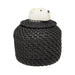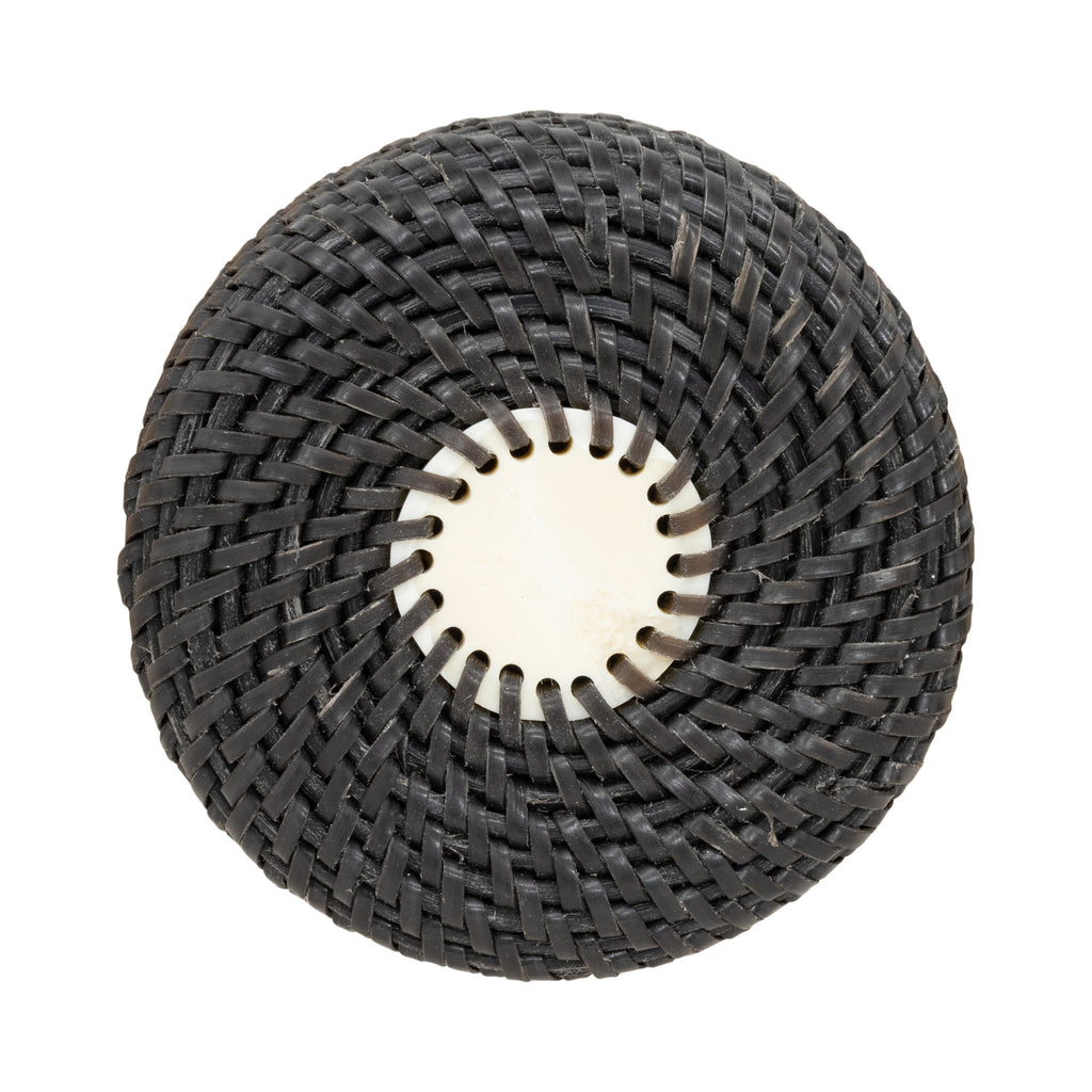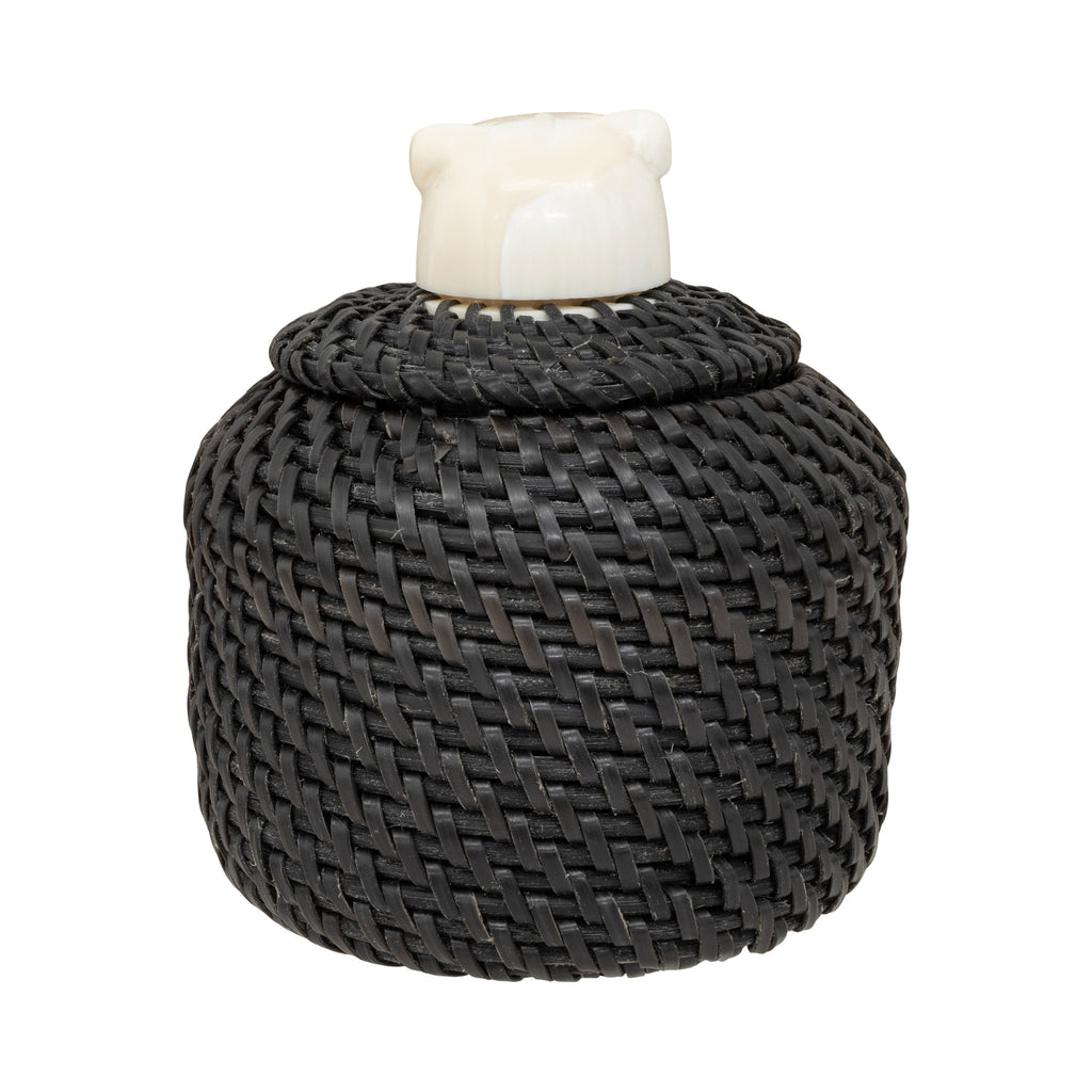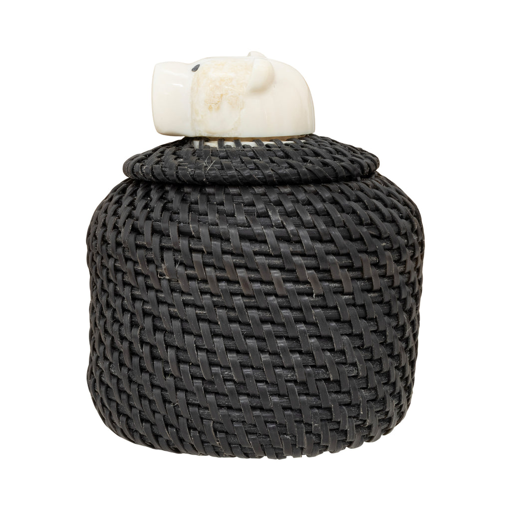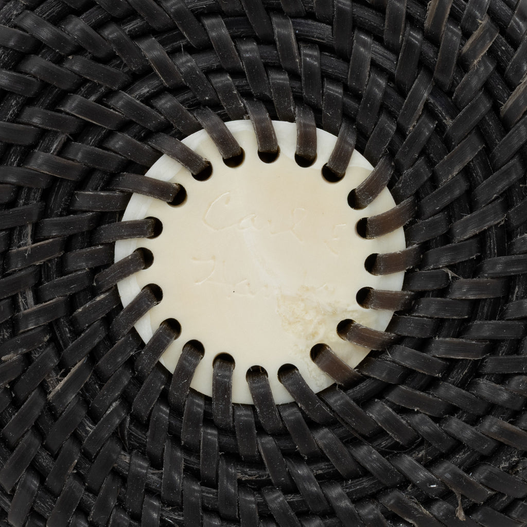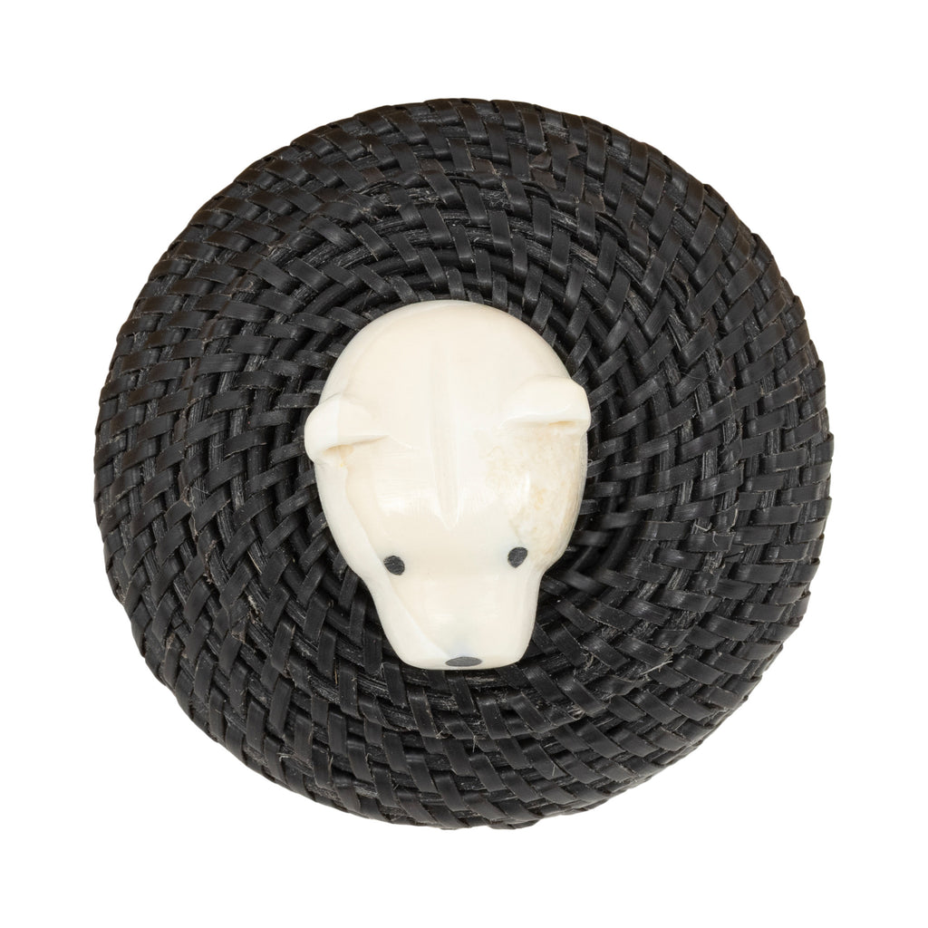 Baleen basket with walrus ivory polar bear head finial decorated with baleen. Bottom signed Carl E. Hank. 2 ¾”D x 3 ½”H top of finial. Carl Hank, Inupiaq, is a baleen basket maker born and residing in Anchorage, Alaska. The story of baleen basketry as an art form that cannot be told without the Hank family. For generations they have kept this unique and laborious weaving tradition alive. Carl is the great-grandson of master weavers Carl and Eunice Hank. His uncle is noted weaver Harry Hank. Carl continues to develop his skills and style and is gaining a reputation as one of the most accomplished baleen basket weavers working today. Baleen is a material obtained by Inupiaq and St. Lawrence islanders from harvested whales, particularly the bowhead. For over half a century, Alaskan Inupiaq Eskimos have created baskets from baleen, a keratinous substance from the mouths of plankton-eating whales. Although not as prevalent as ivory, baleen basketry significantly supports the livelihoods of weavers in arctic villages in Alaska. Collectors of Alaskan Native art highly seek these baskets, with contemporary weavers producing beautifully shaped, finely woven pieces, some featuring multicolored baleen. Today, there are only a handful of people who weave baleen baskets and in limited areas. Most baskets are twined. The baleen is stripped, soaked in water and then woven. Typically, weavers start these round baskets with an ivory disc at the bottom, which has holes around its periphery. They then finish the top with an ivory or bone ornamenting the lid, often adorned with finial figures. Only Alaskan Natives are allowed to harvest and use baleen.