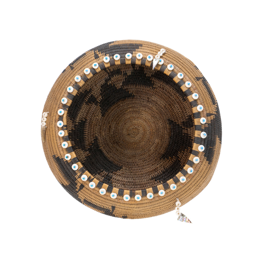 Very fine Pomo basket with white shell beads with blue centers on rim and three spaced abalone drops on sides. Under the name Pomo are some 30 small tribes. The tribes which made these baskets live in Lake Sonoma and Mendocino counties, and are examples of their best work. The materials used are California sedge, nut pine, black rooted sedge, Sitka willow, Douglass spruce beaked hazel, California flax, red fir, poison oak, bracken, bullrush, nutmeg, Oregon grape, syringa, maiden-hair fern, digger pine, green briar, willow, redbud, bracken, calycanthus and hazelnut.