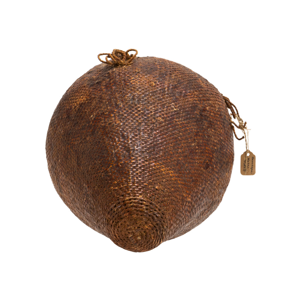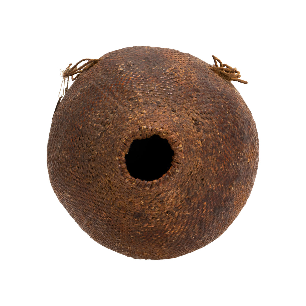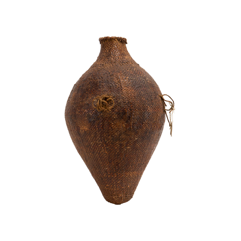 Havasupai water olla with old collection tag “W.L.ELLARSON.” Once pitch covered, store string loops.