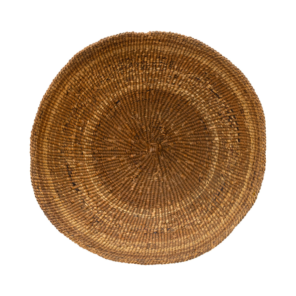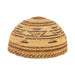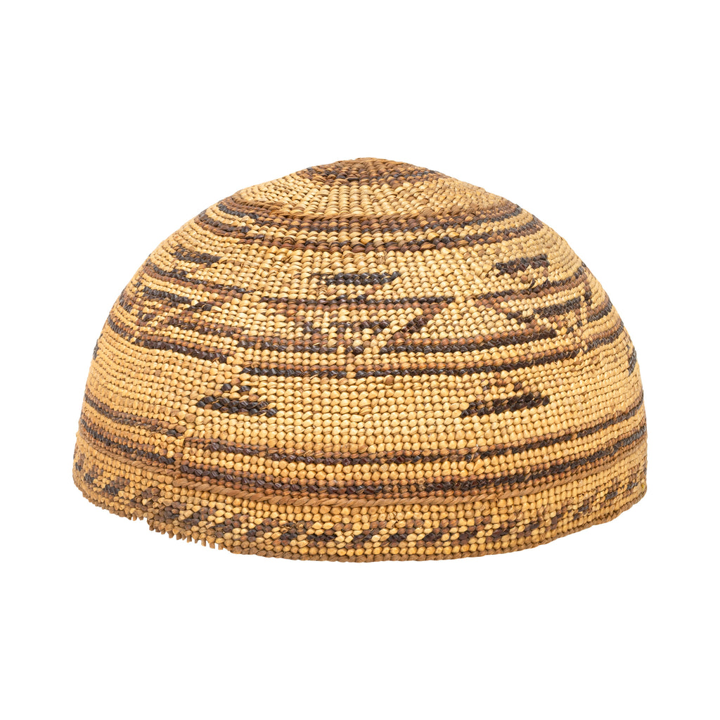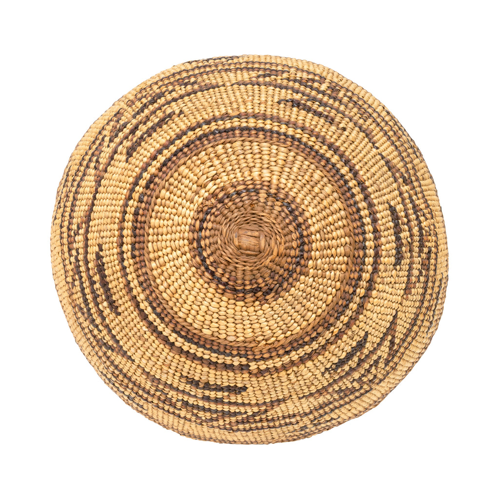 Hupa/Yurok polychrome basket. Two strand plain twining with three strand twining at base. Warps: hazel shoots, Corylus rostrata californica. Decoration by half-twist overlay of bear grass, Xerophyllum tenax; (light); msidenhair fern, Adiantum pedatum, (dark). Ex. Clay P. Bedford Collection. Exhibited The California Academy of Sciences, San Francisco, "Western North American Indian Baskets from the Collection Clay P. Bedford," April 16 - October 19, 1980. Illustrated, 1980. P. 10 Figure 12. 7"D x 4"H