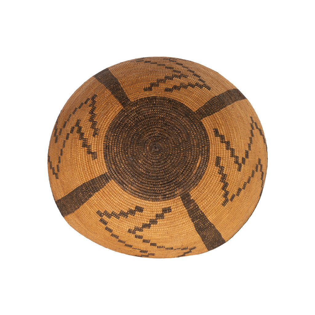 Large Pima basket with devils claw center, four spokes and geometric stair step design. 7" x 20".