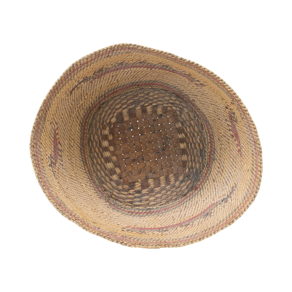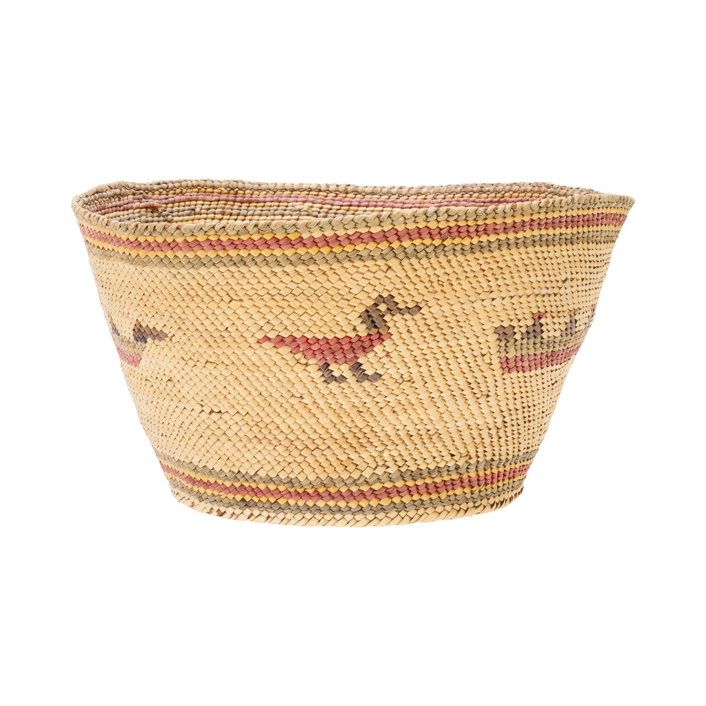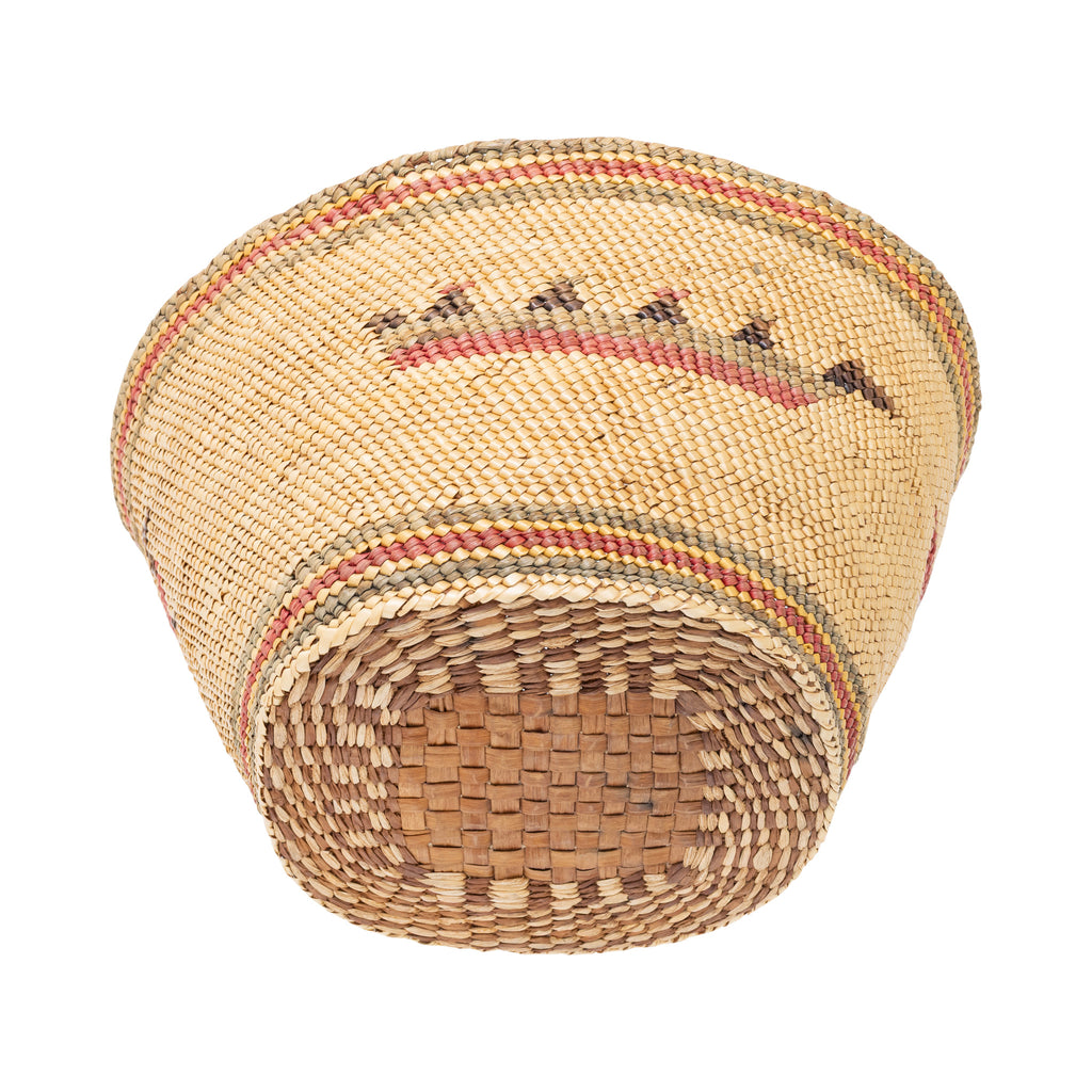 Makah basket with boat and bird scene. In the 1860s the Makah people at Neah Bay developed a cottage industry producing trinket baskets. These were very labor intensive, fully twined baskets of twisted cedar bark. Through the 1930s they wove thousands of the small colorful trinket baskets for sale. Top 7"D x 4". Circa 1900.