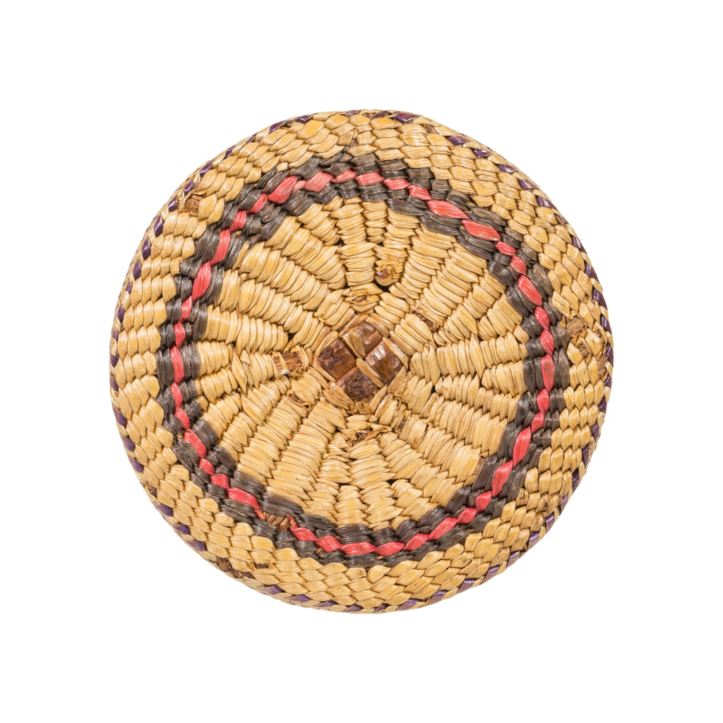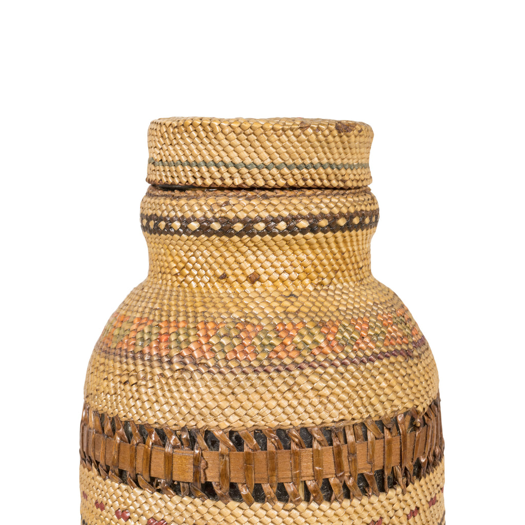 Finely woven Makah/Nootka bottle basket. Polychrome with geometric bands. In the 1860s the Makah people at Neah Bay developed a cottage industry producing trinket baskets. These were very labor intensive, fully twined baskets of twisted cedar bark. Throug