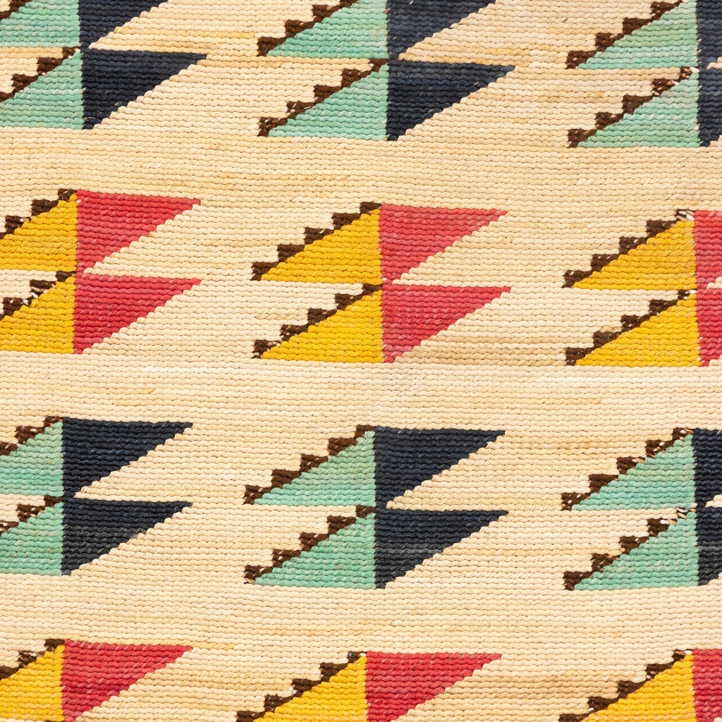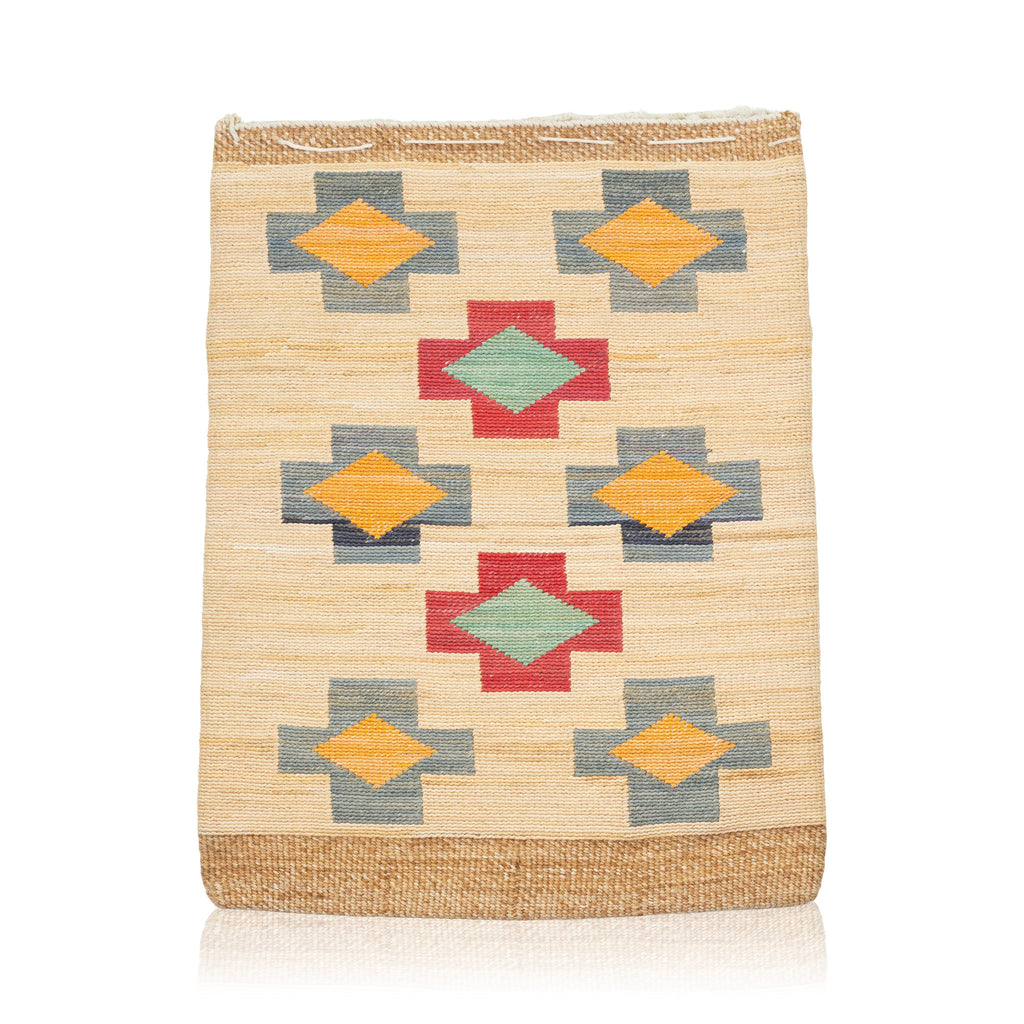 Nez Perce corn husk. Corn husk on corn husk. Different geometrics both sides with store twine on rim.