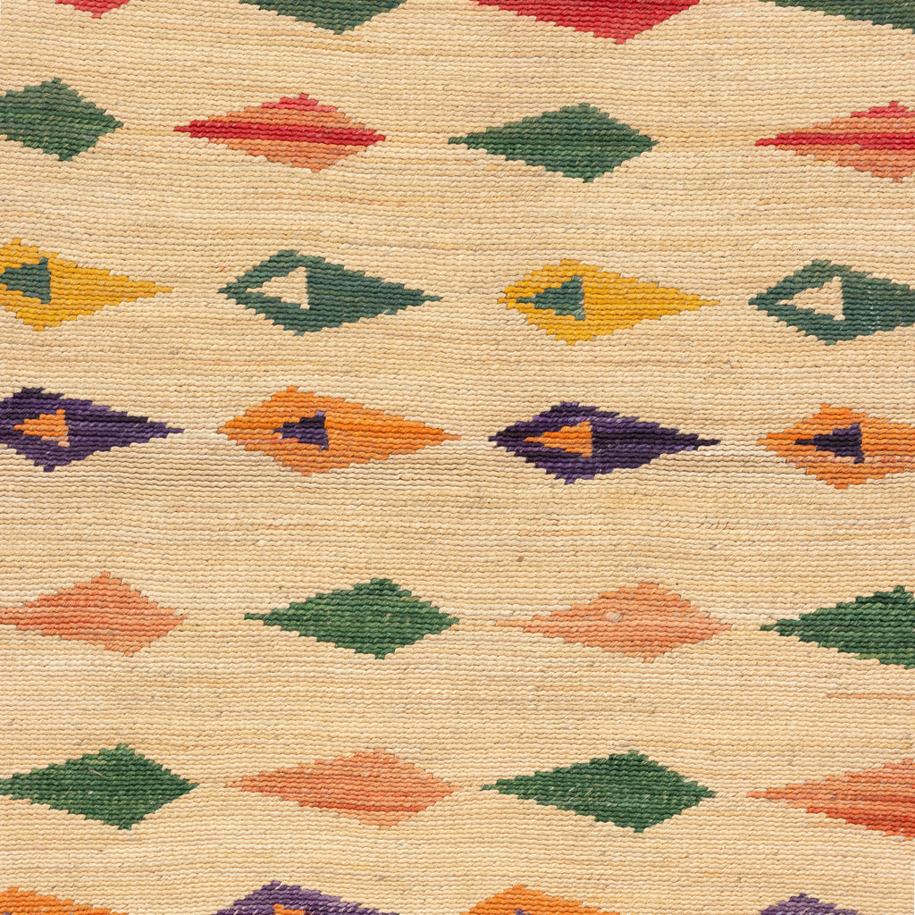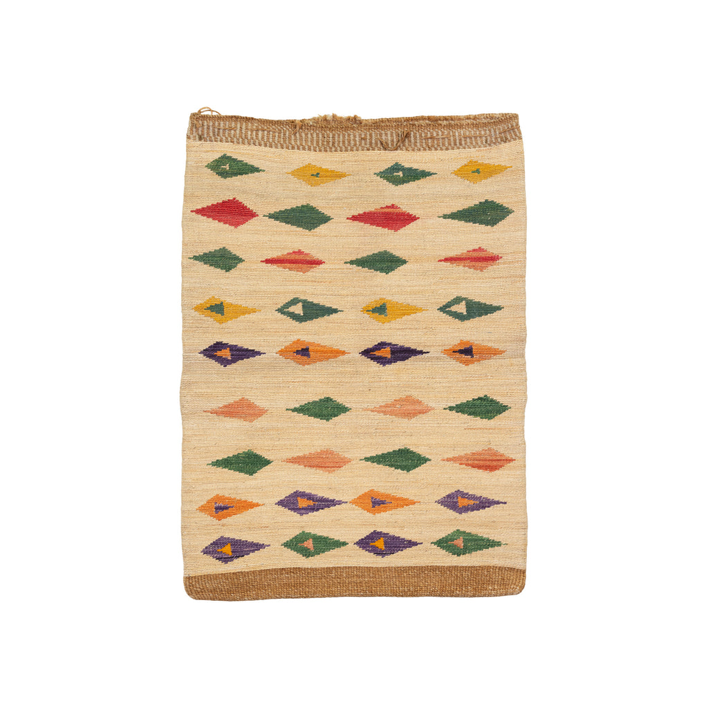Nez Perce corn husk with dyed corn husk on corn husk one side, and linen on corn husk on reverse. One side geometric, the other stylized quail fobs. Trunk piece.