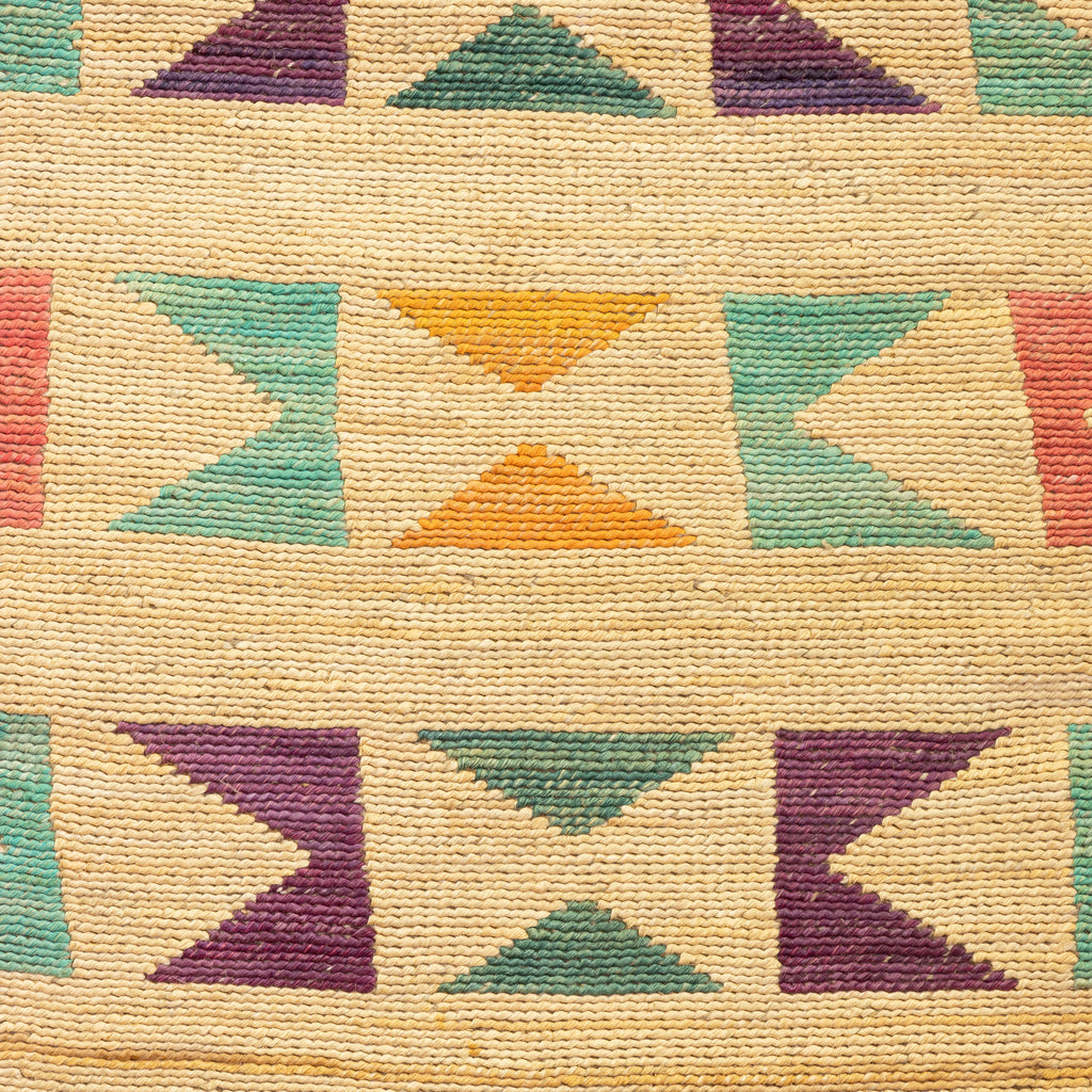 Nez Perce corn husk. Dyed corn husk on corn husk. Different geometrics both sides. Trunk piece.
