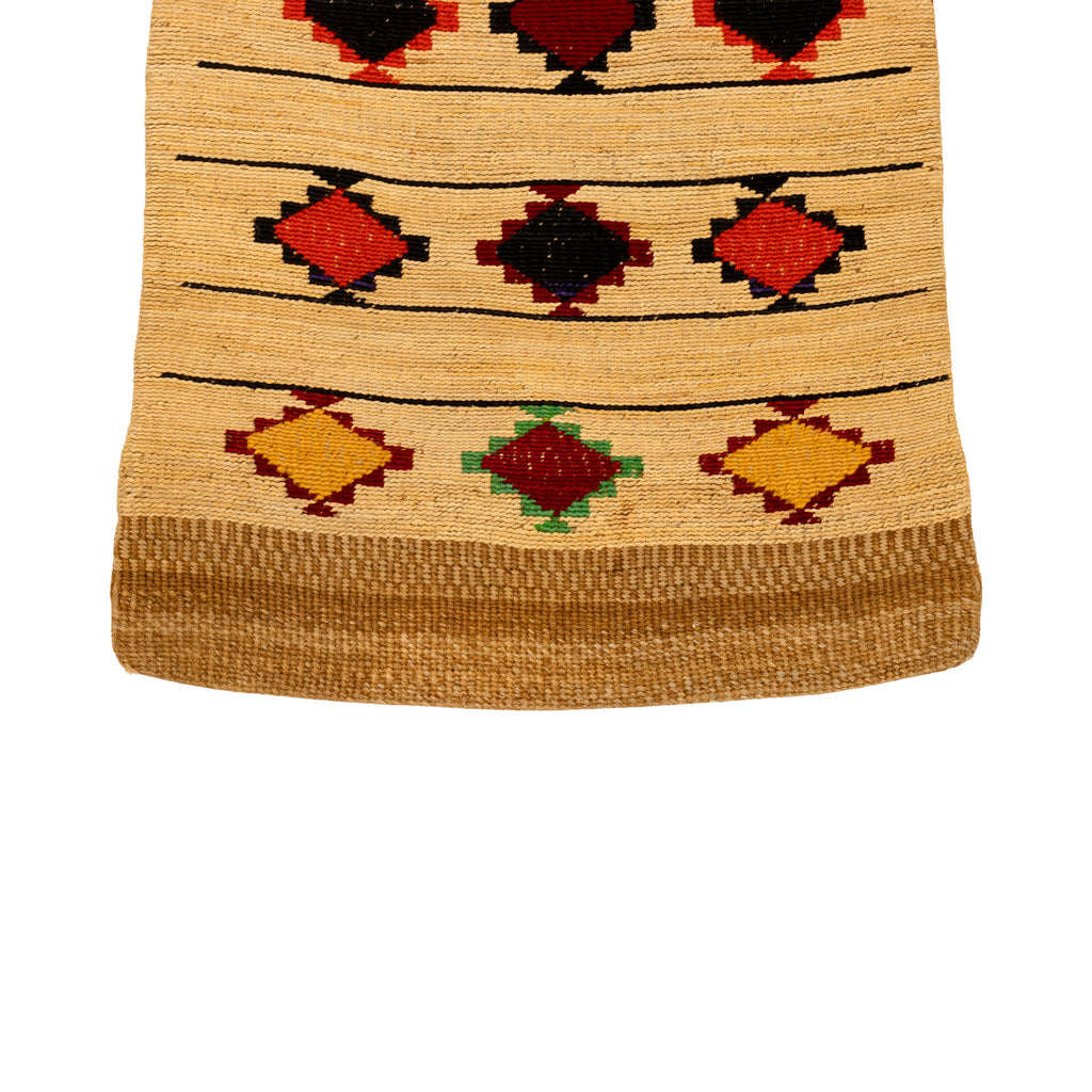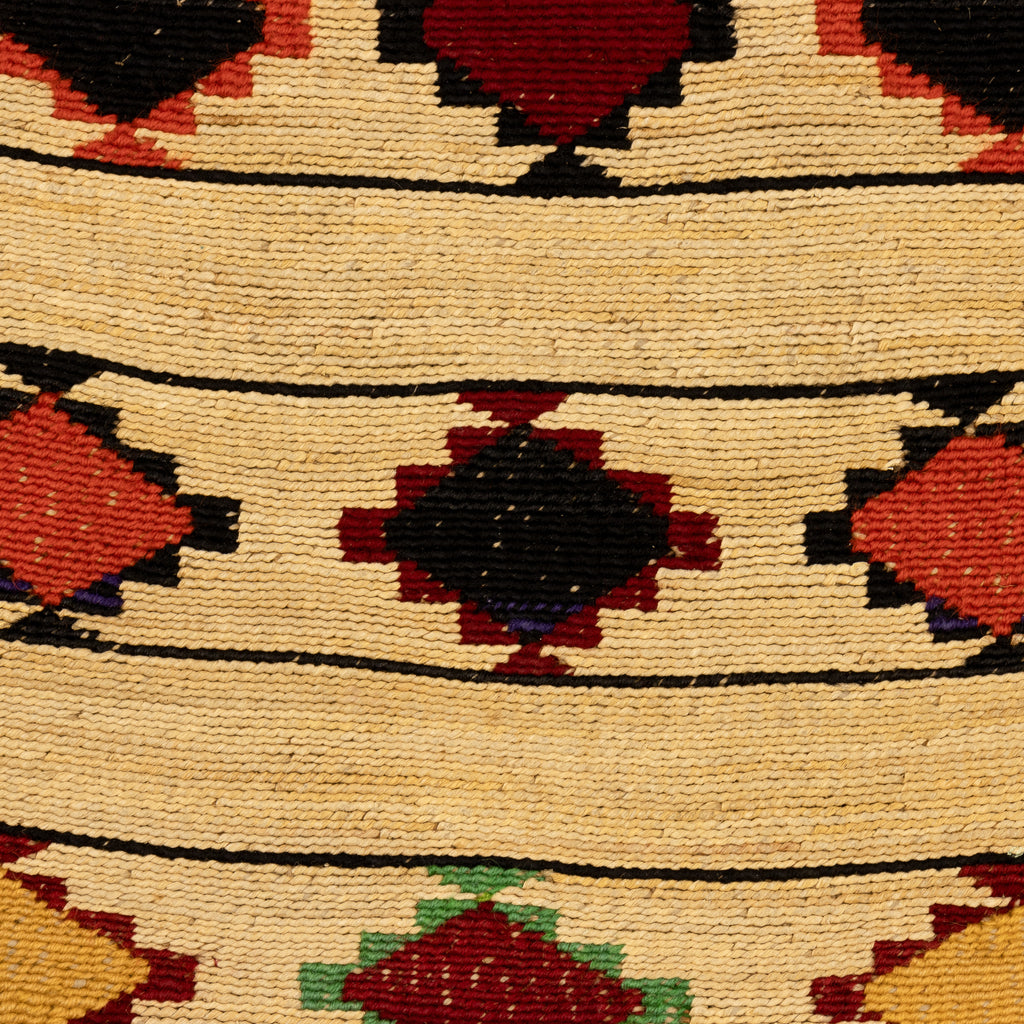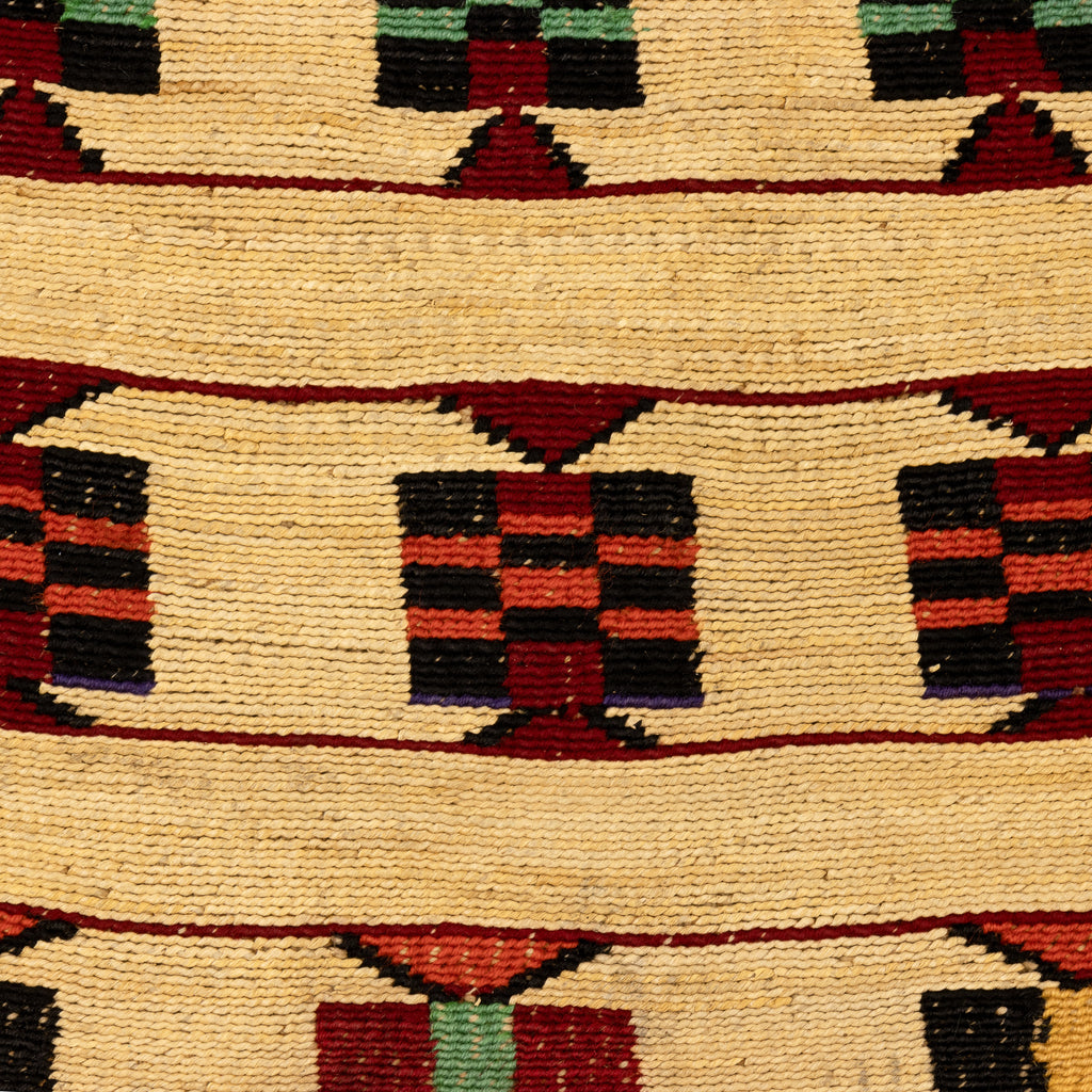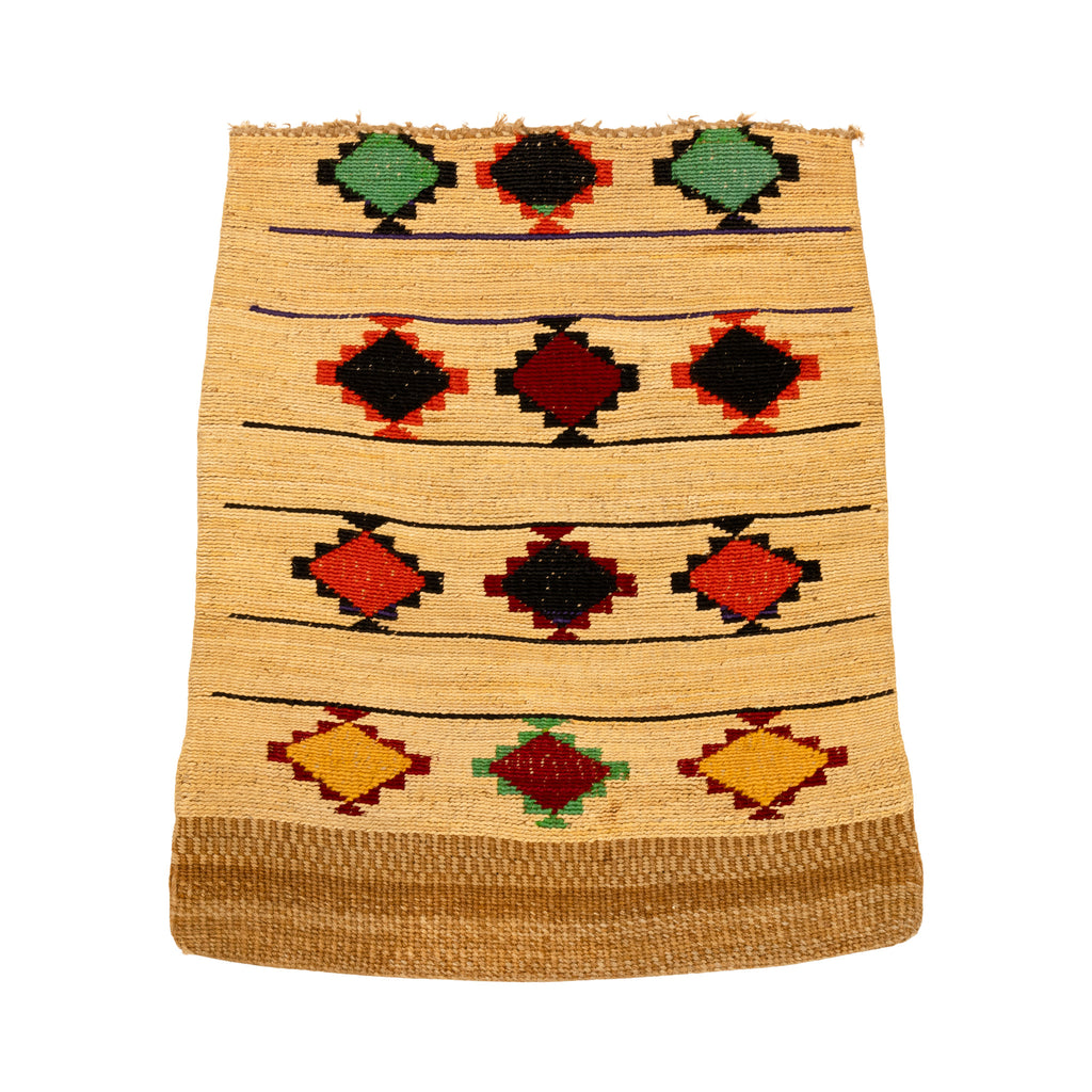 Nez Perce corn husk bag. Linen on corn husk. Different geometric designs both sides, with bands, bright vibrant colors. 18"L x 16"W