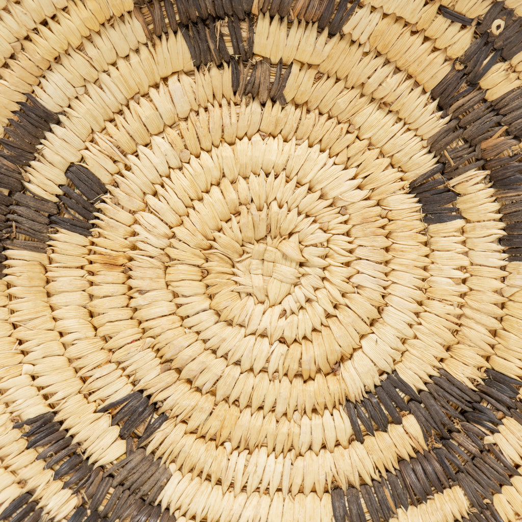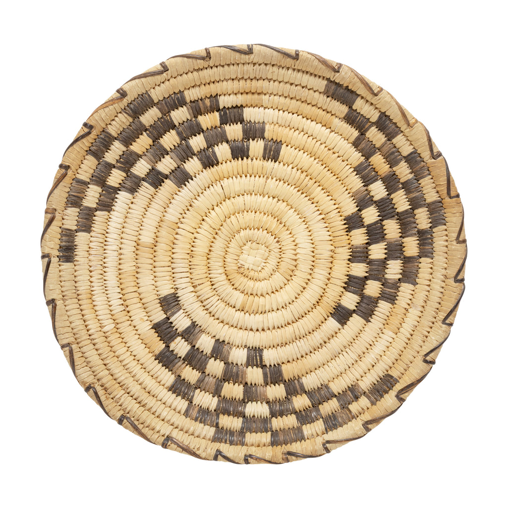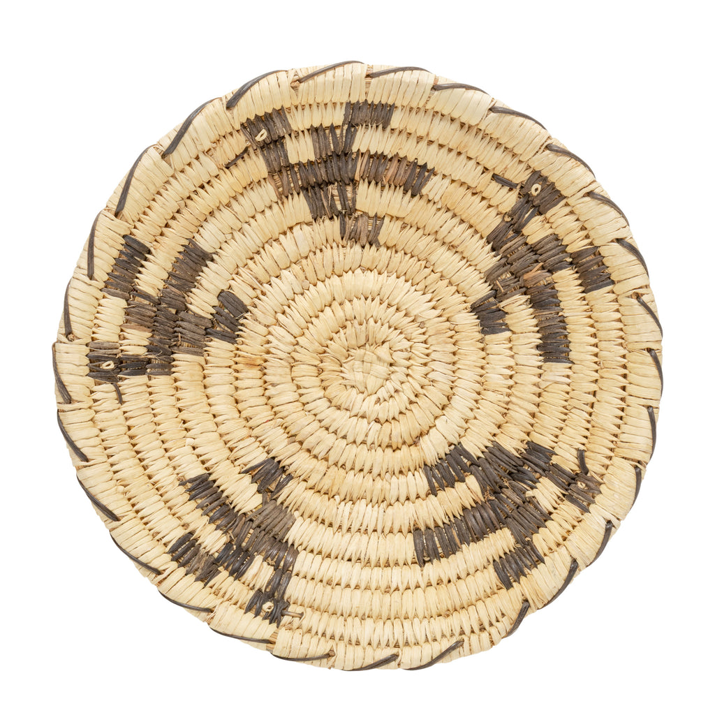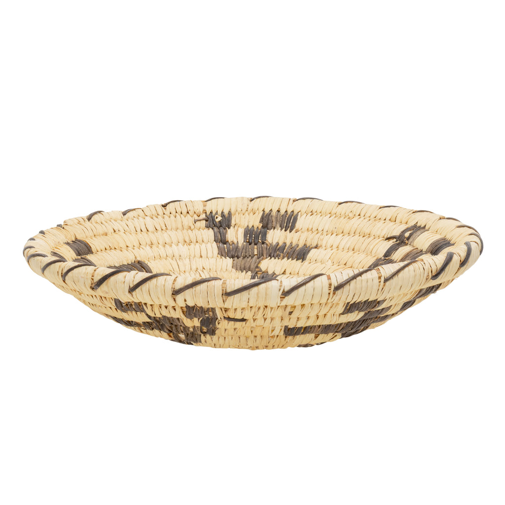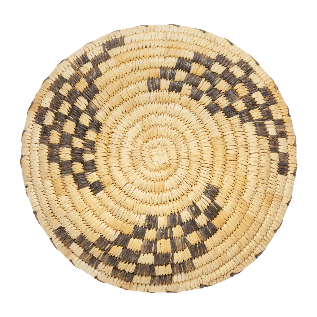 Pair of Papago platters. Mid 20th Century. Figurative Papago with birds 9 1/2" x 2" and 11" x 1 1/2". Papago baskets are handcrafted of beargrass, yucca cactus (white or green) and Devil’s Claw (black). The technique used is known as coiling. Split stitch baskets are made of beargrass and sewn with yucca in such a manner that the coil is exposed to form part of the pattern. Made on the Papago Reservation in Southern Arizona, bounded on the east by historic San Xavier Mission on the west by organ Pipe Cactus National Monument.