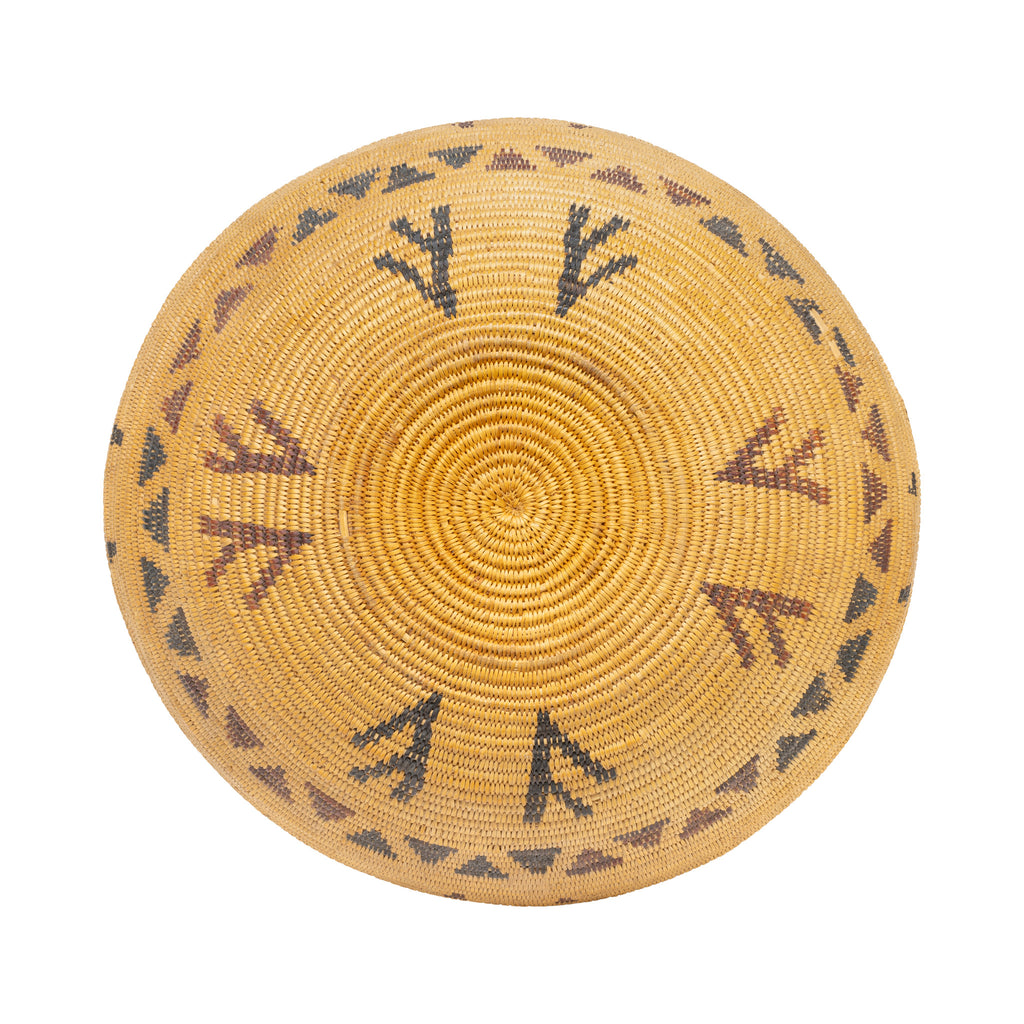 Panamint polychrome basketry bowl with geometric design and turkey tracks. 5" x 13"