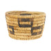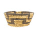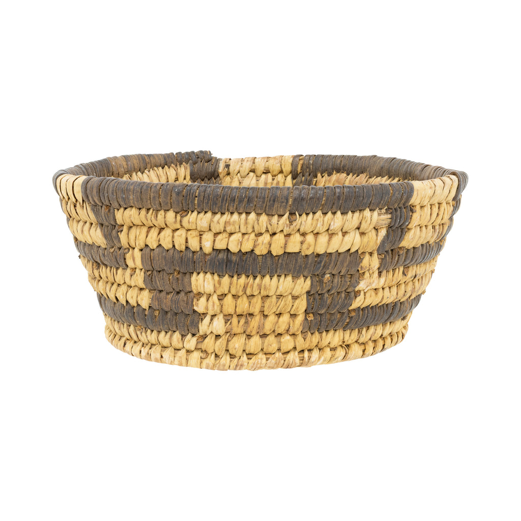 Three small Papago basketry polychrome bowls. Mid 20th Century. 5" x 2 1/2" cylindrical 5" x 3", and 4" x 2". Papago baskets are handcrafted of beargrass, yucca cactus (white or green) and Devil’s Claw (black). The technique used is known as coiling. Split stitch baskets are made of beargrass and sewn with yucca in such a manner that the coil is exposed to form part of the pattern. Made on the Papago Reservation in Southern Arizona, bounded on the east by historic San Xavier Mission on the west by organ Pipe Cactus National Monument.