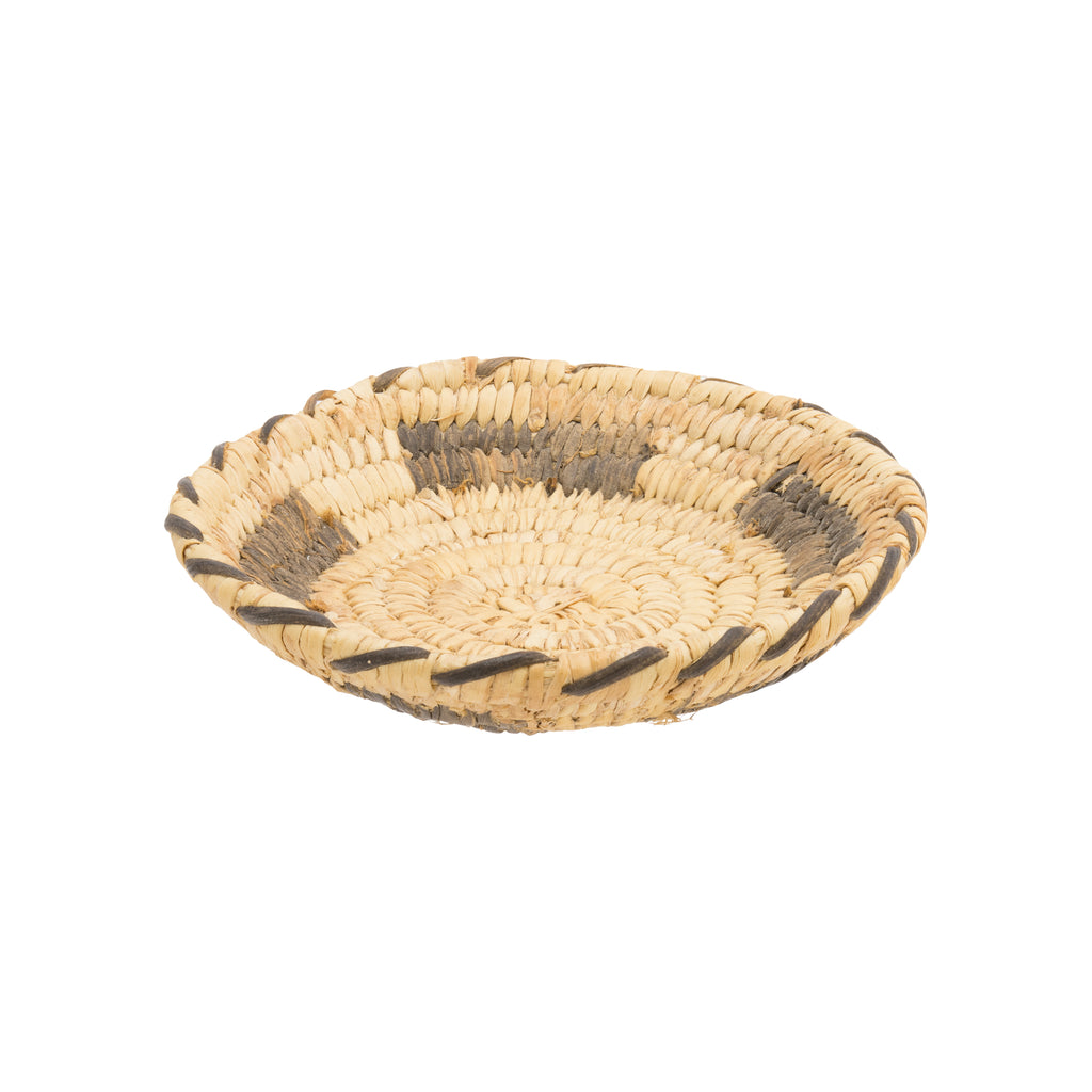Six Papago miniature baskets. Two with owls. Five of yucca and one of pine needle. Papago baskets are handcrafted of beargrass, yucca cactus (white or green) and Devil’s Claw (black). The technique used is known as coiling. Split stitch baskets are made of beargrass and sewn with yucca in such a manner that the coil is exposed to form part of the pattern.