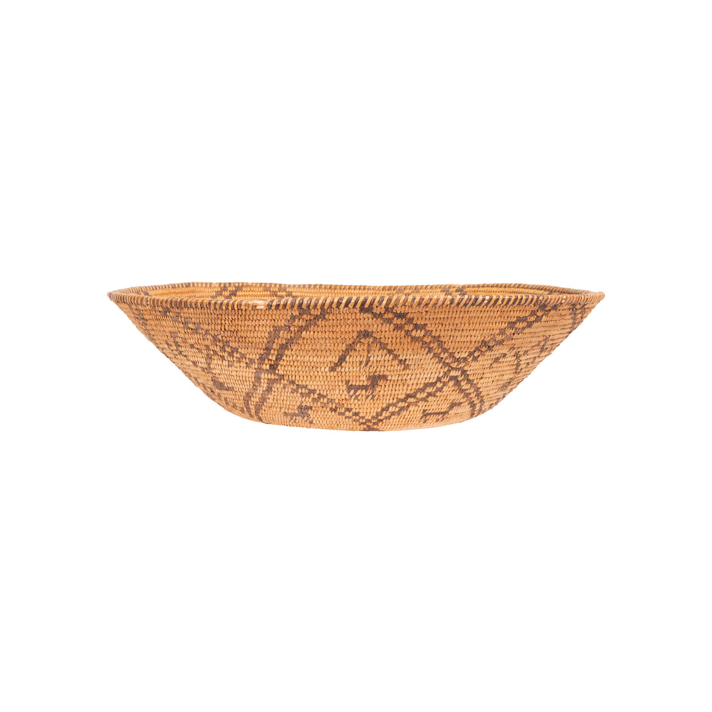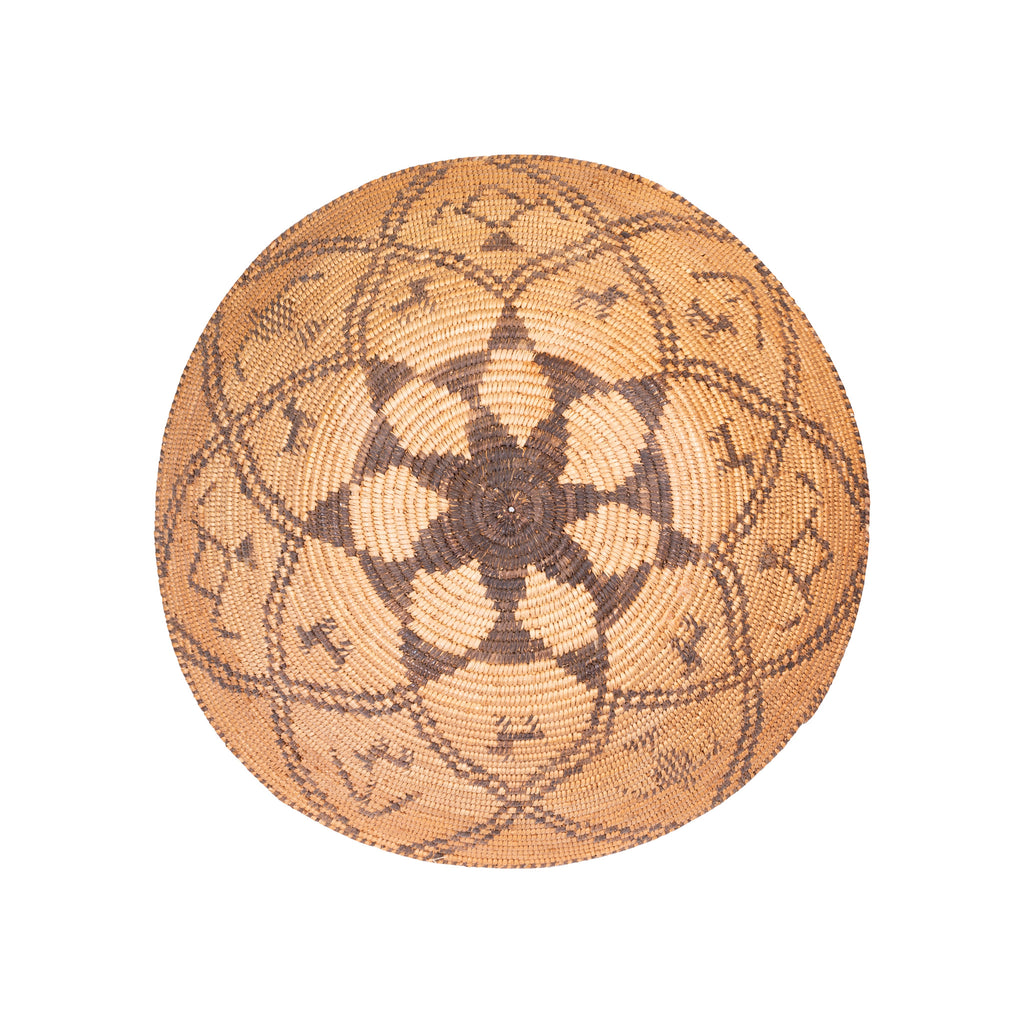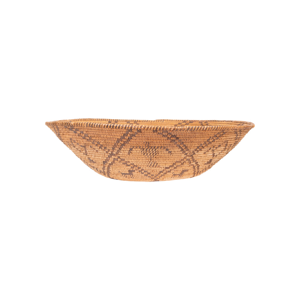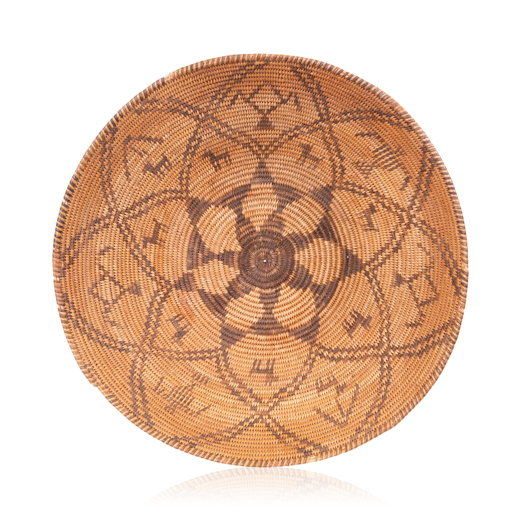 Finely woven pictorial Apache basket with flower design, dogs, humanoids and geometrics. Apache trays have traditionally been created by women in flat, curved, and bowl forms like this example. Those with pictorial elements are coveted, and the coloratio