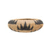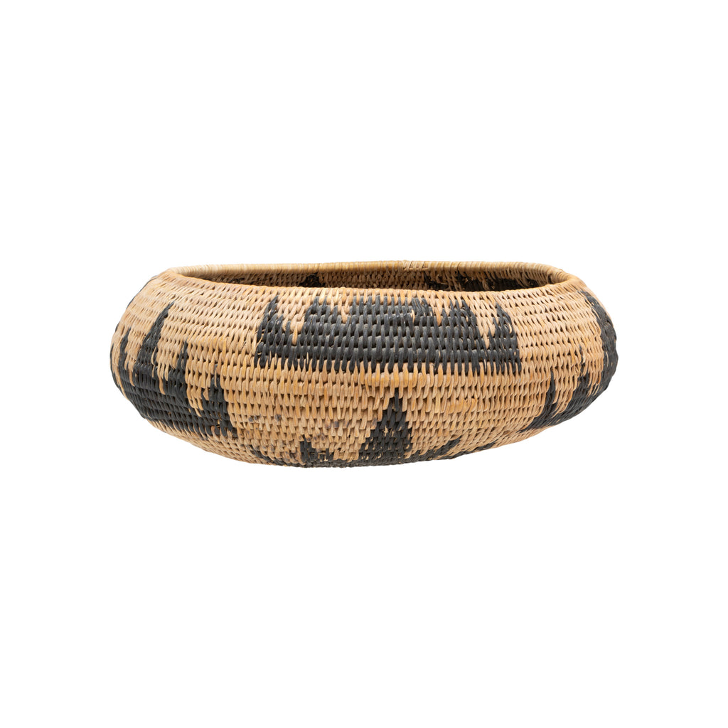Pomo basket with geometric design. Under the name Pomo are some 30 small tribes. The tribes which made these baskets live in Lake Sonoma and Mendocino counties, and are examples of their best work. The materials used are California sedge, nut pine, black rooted sedge, Sitka willow, Douglass spruce beaked hazel, California flax, red fir, poison oak, bracken, bullrush, nutmeg, Oregon grape, syringa, maiden-hair fern, digger pine, green briar, willow, redbud, bracken, calycanthus and hazelnut. 7" dia x 2 1/2"H