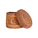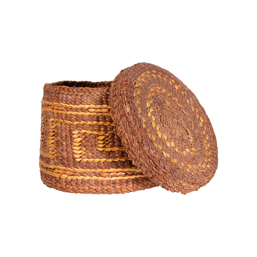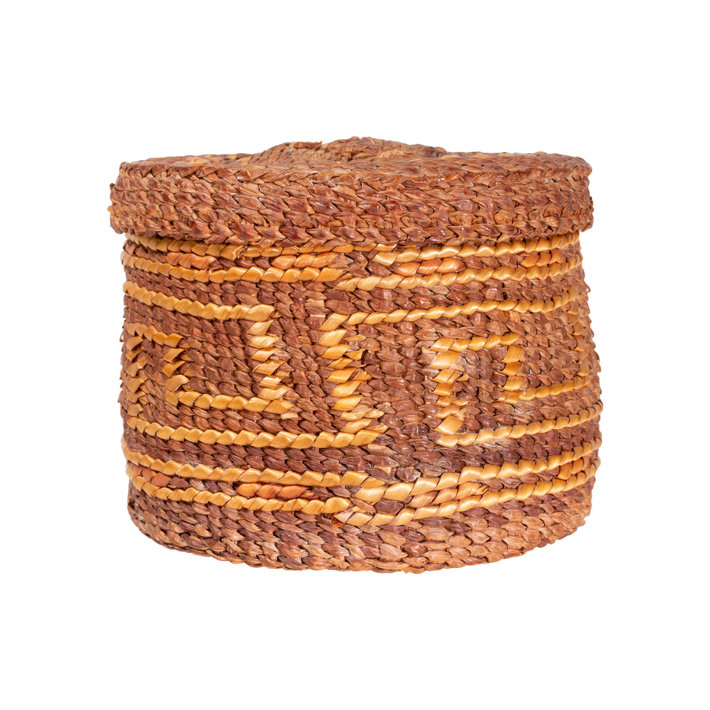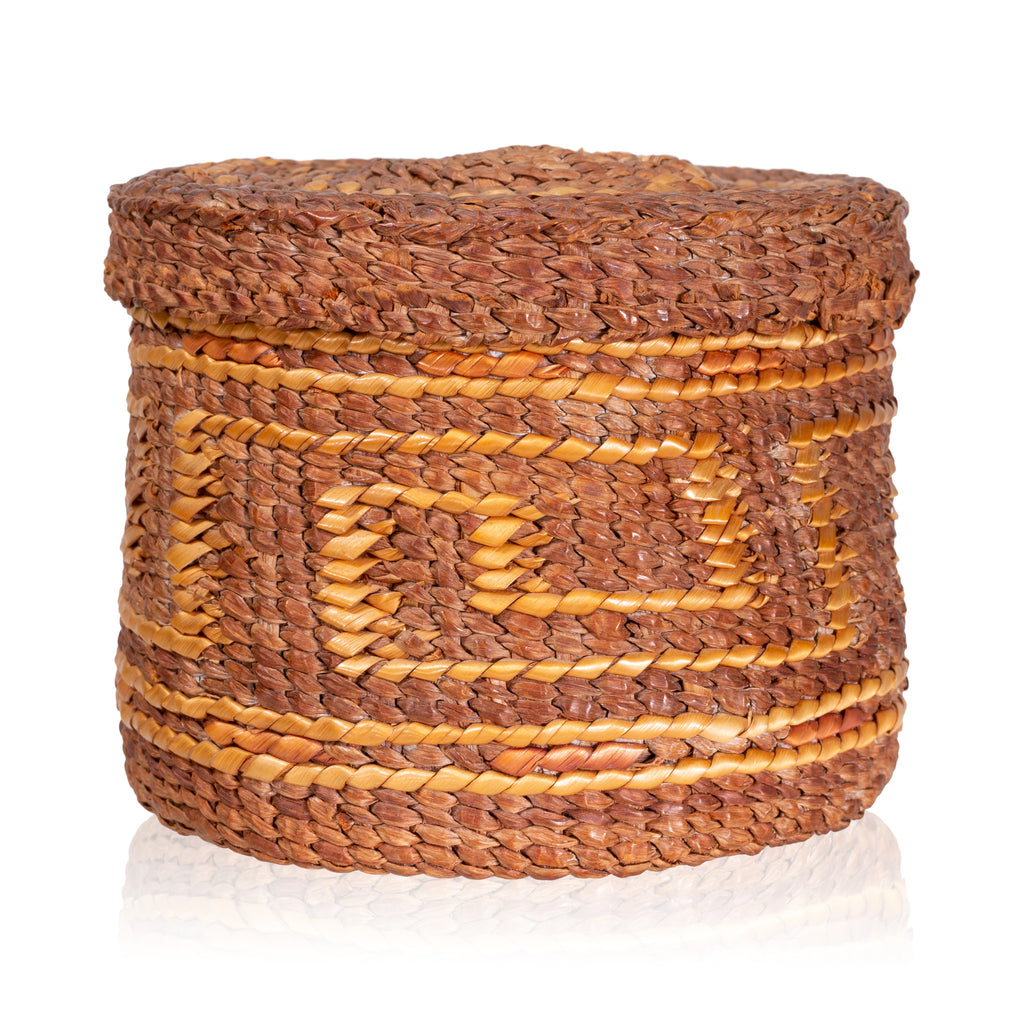 Miniature lidded Tsimshian basket with yellow imbricated design.
