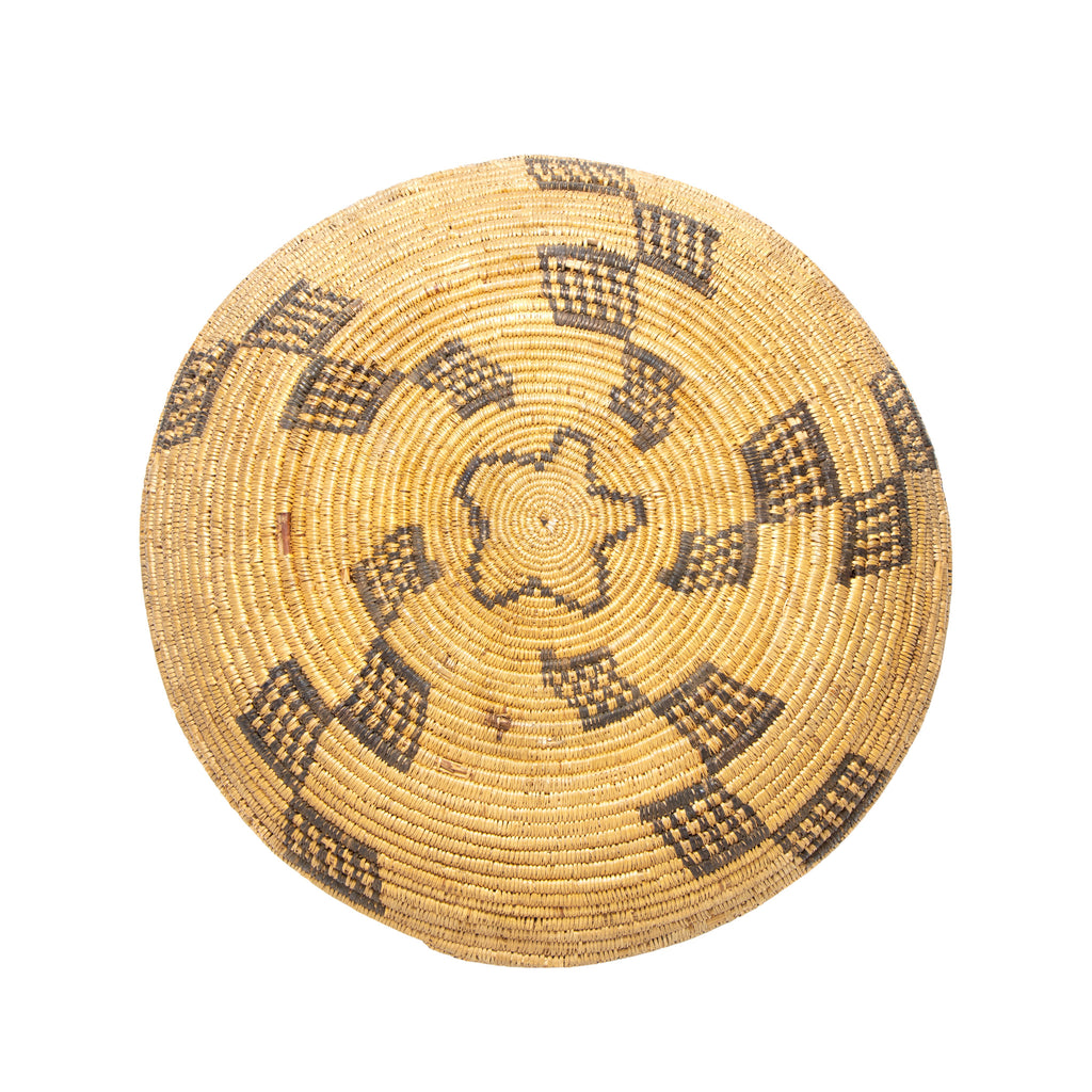 3" x 15" Yuma Apache basket. Graphic with wonderful golden patina. Apache trays have traditionally been created by women in flat, curved, and bowl forms like this example. Those with pictorial elements are coveted, and the coloration oxidizes over time t