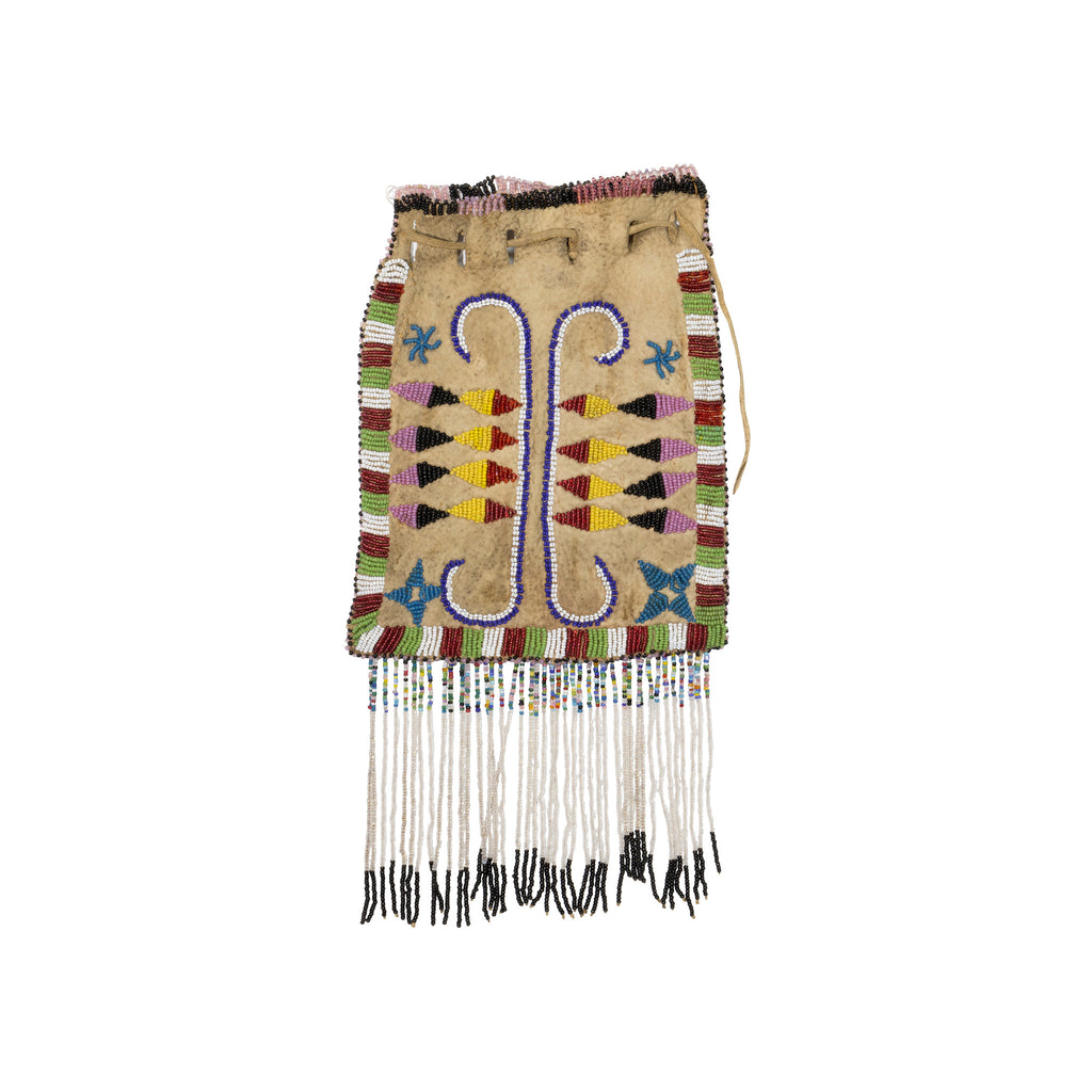 Apache made beaded pouch. Beaded both sides different. Thread sewn on antelope hide. 6" x 7" plus 4" fringe