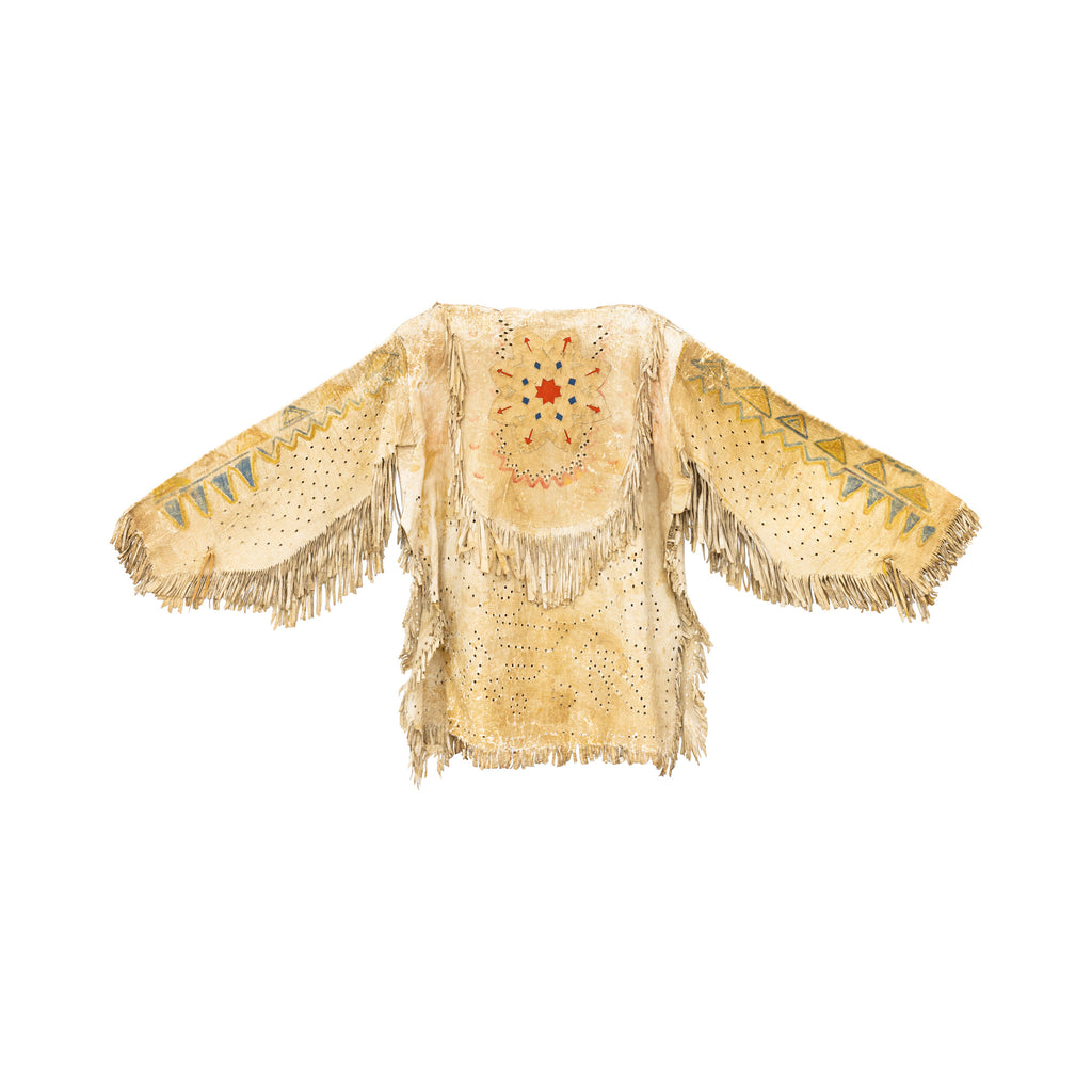 Mid 19th century Western Apache war shirt of brain tanned mountain lion hide, perforated for ventilation showing an eight point star, fringed and painted in earth pigments. Eight point star overlay on back with red and blue trade cloth backing. 16" shoulder, 21" sleeves.