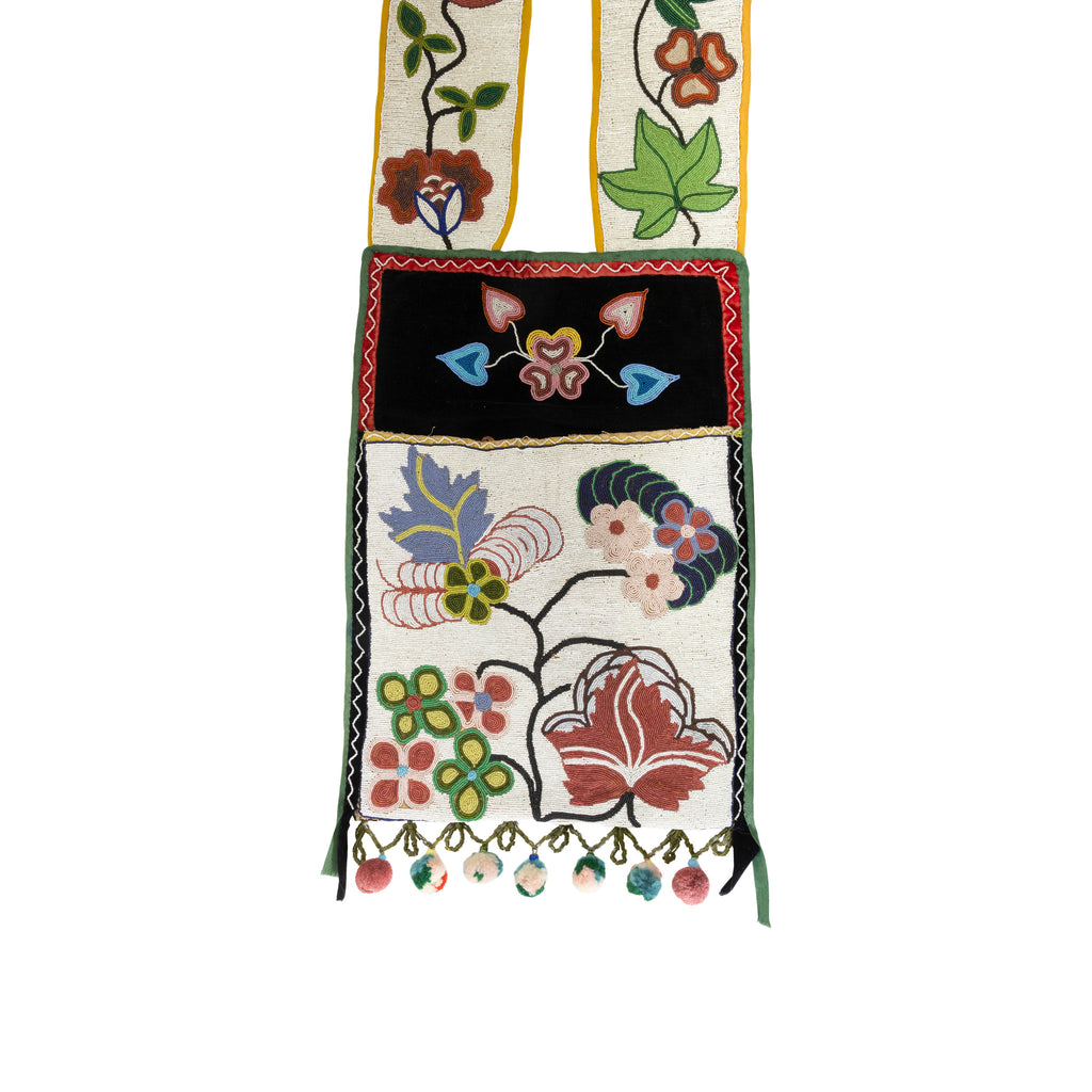 Assiniboine fully beaded bandolier bag with full pocket. Floral and leaf design with green bugle bead drops ending in pompoms. Full size pouch. Ex John Behnken.