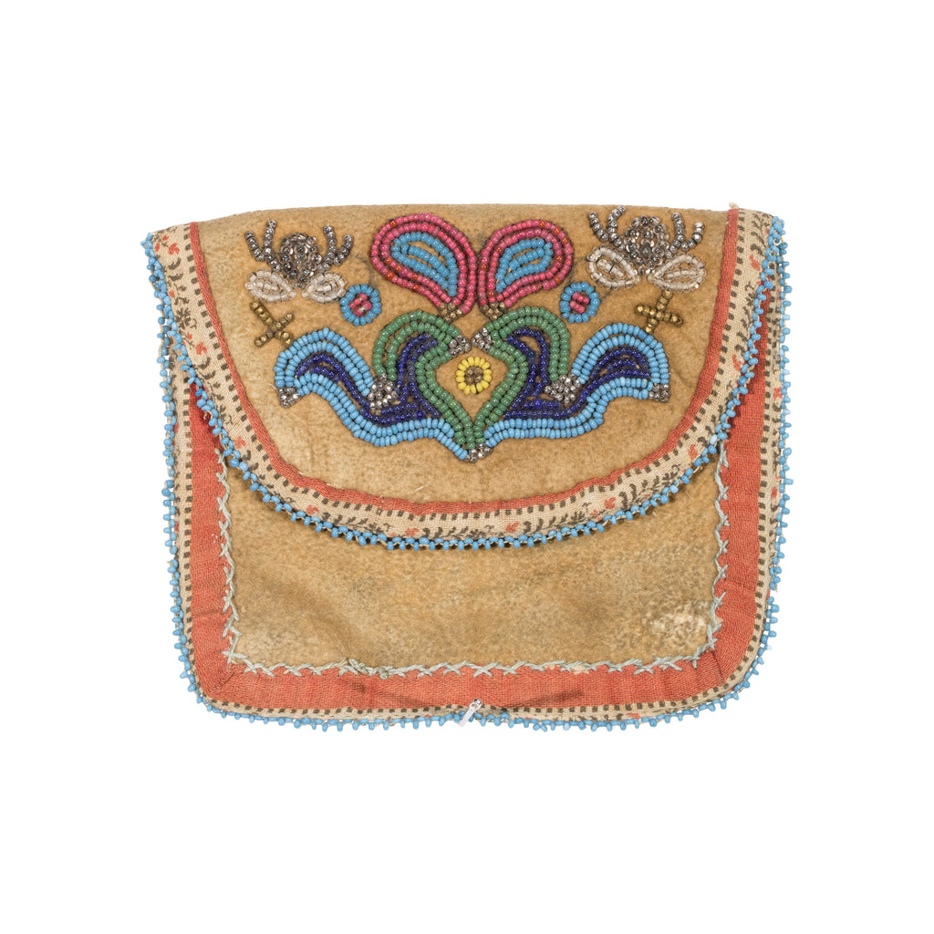 Cree made beaded pouch with beaded flap. Silk borders and small blue beaded edging. Smoke tanned, sinew sewn, metallic beads. 4" x 4 1/2"