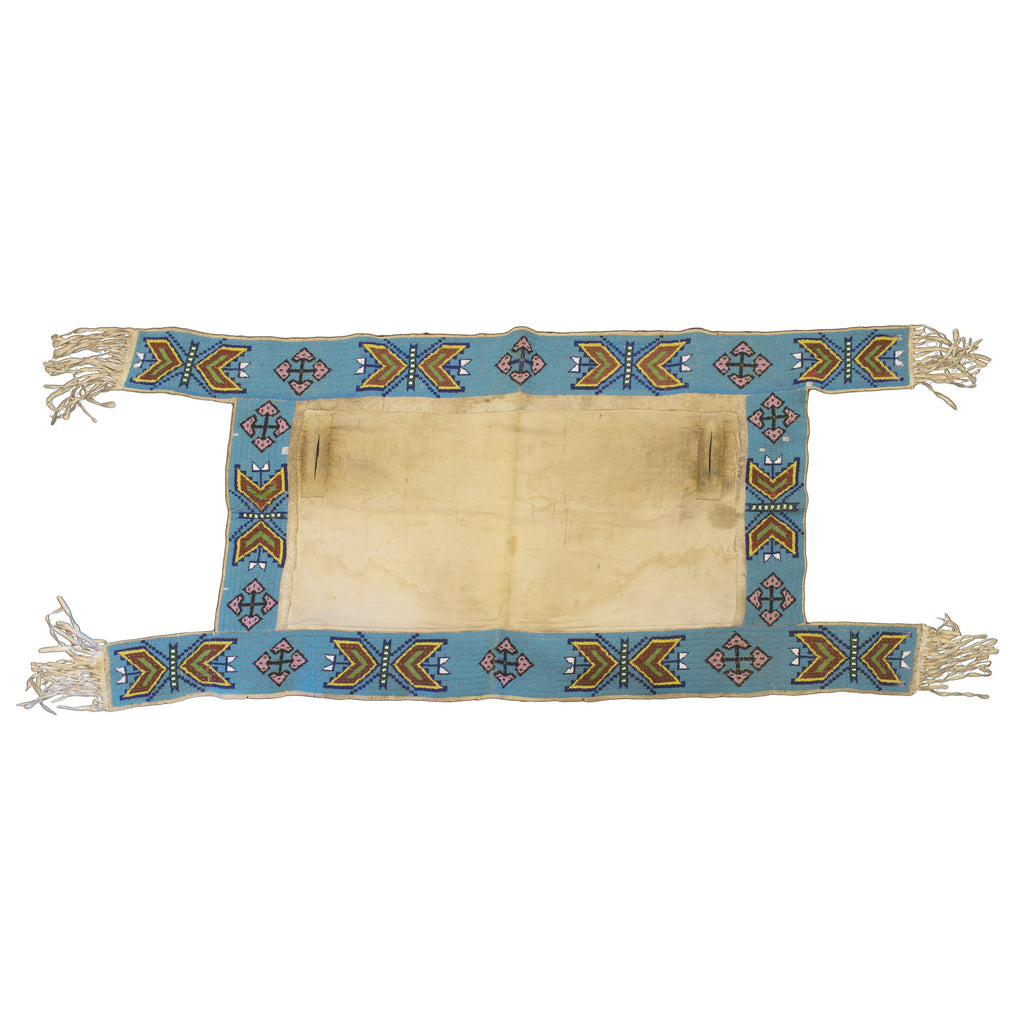 Unique blue beaded Sioux saddle blanket with canvas center. Includes a photo from the cover page of Appaloosa News, showing this blanket 8/1996. 73"x29"