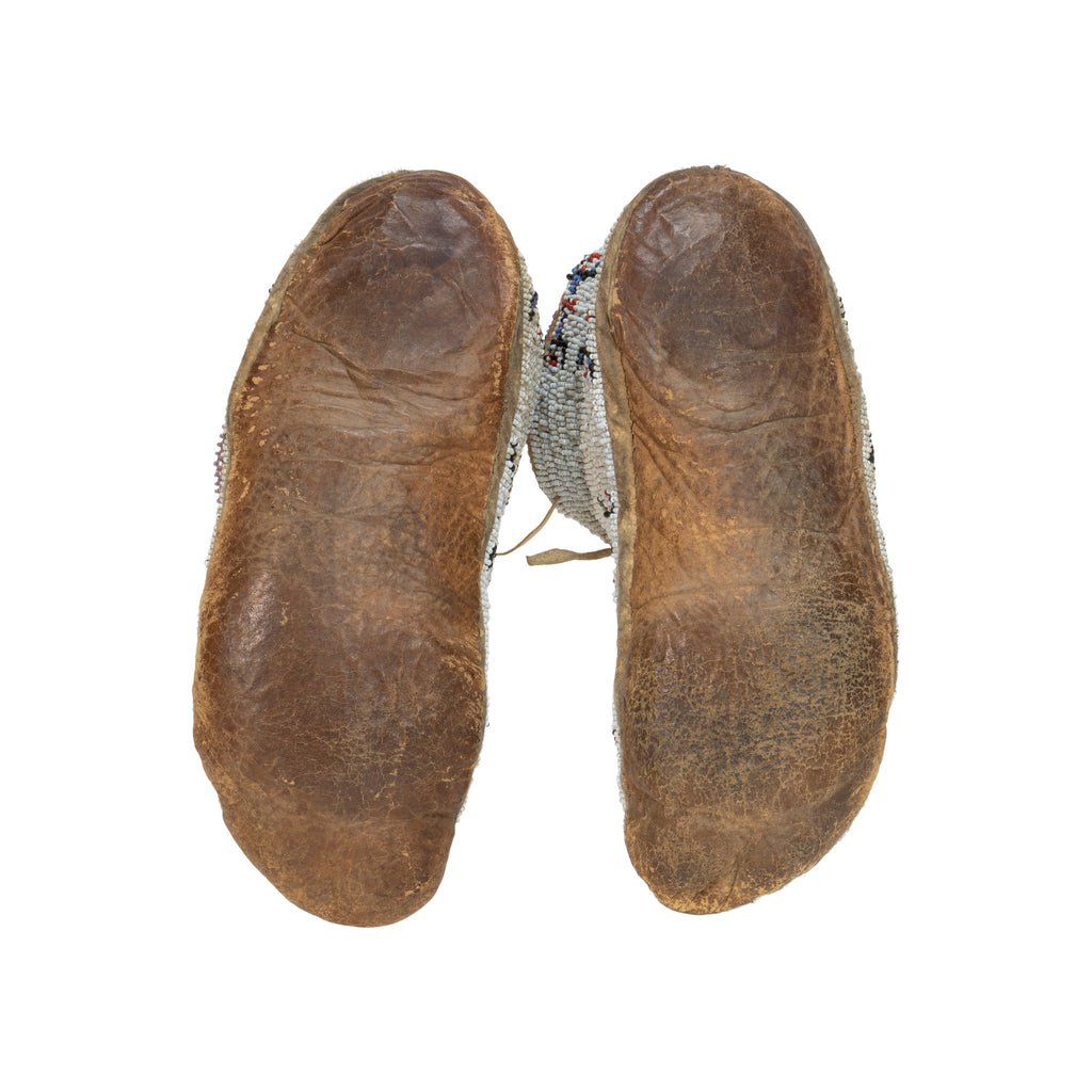 Fully beaded Cheyenne moccasins including edge beading on tops and flaps. Soft and worn soles. Fully beaded moccasins were made as special gifts for elders, respected individuals, or during rites of passages for events such as births, marriages, or graduations. Because of the skill and time required, they are collected as art pieces or displayed in museums to preserve cultural history.