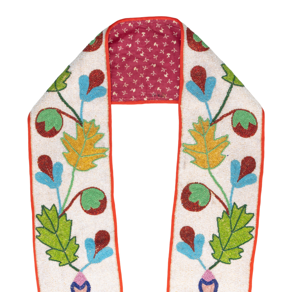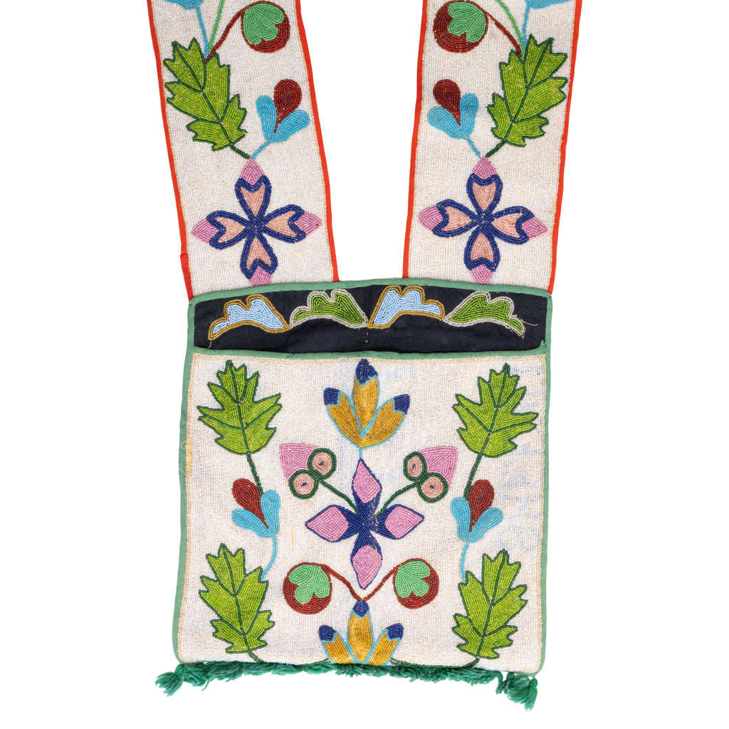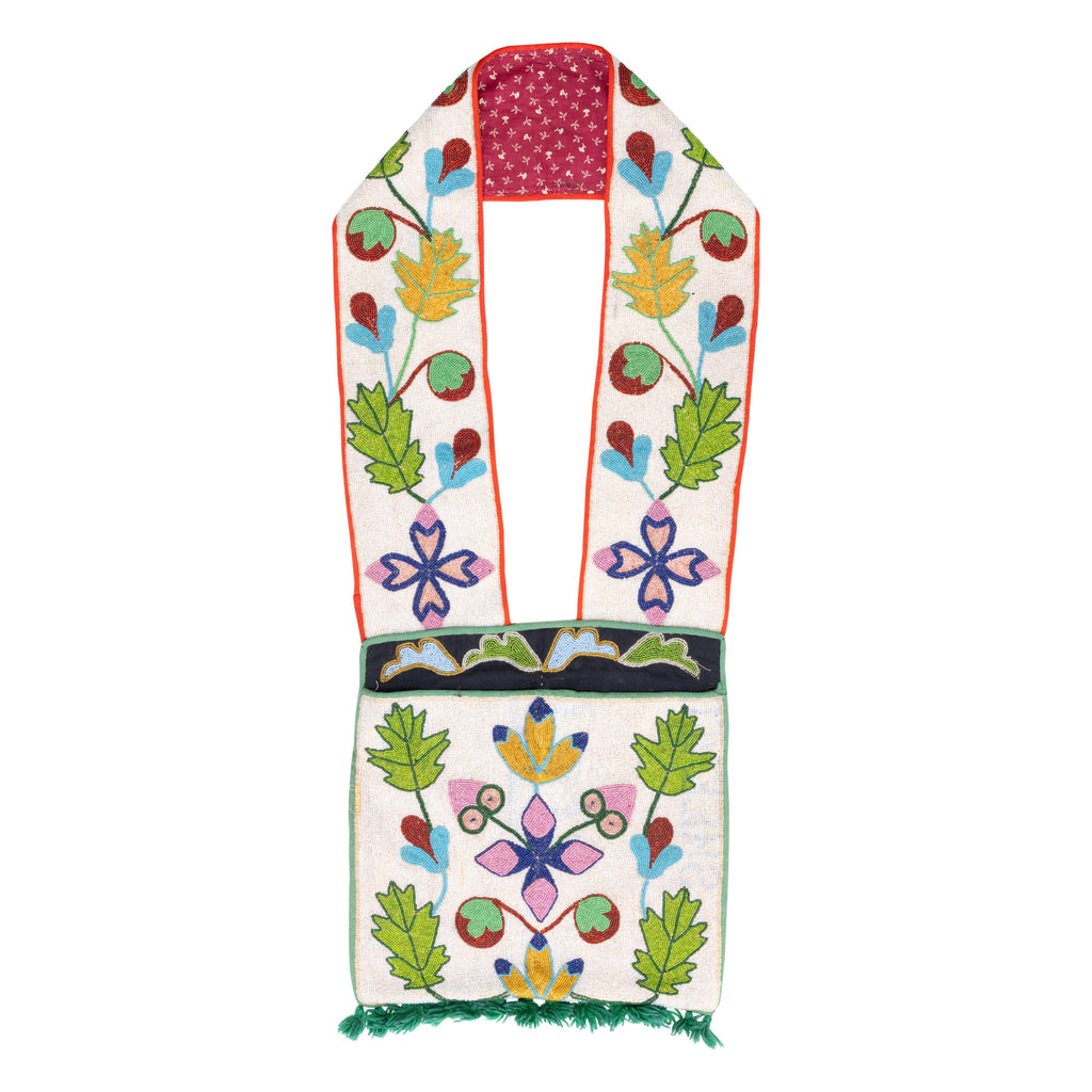 Vintage Great Lakes beaded bandolier bag with rectangular pocket and wide strap worked with vining foliate motifs. Larger than most. Inside the bag was a handwritten note on a scrap of newspaper "Roman Logan 8/7/33." We assume the owner of the bag. Roman's "Hun-Kaw-Tun-Kah" Logan 1860- 1934. He was a member and leader of the Osage Nation. 40"L x 14 3/4"W