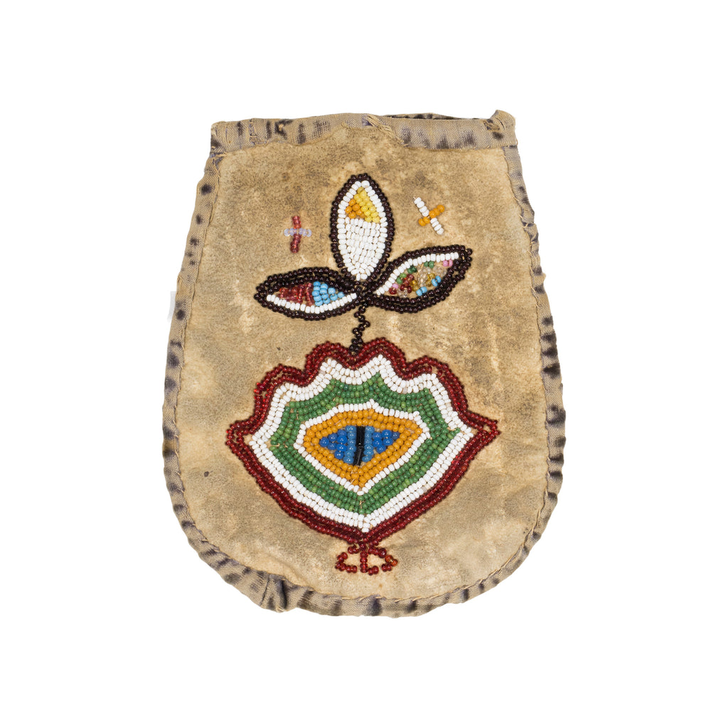 Kiowa made medicine pouch. Beaded different both sides with silk edging on brain tanned. 5" x 4"