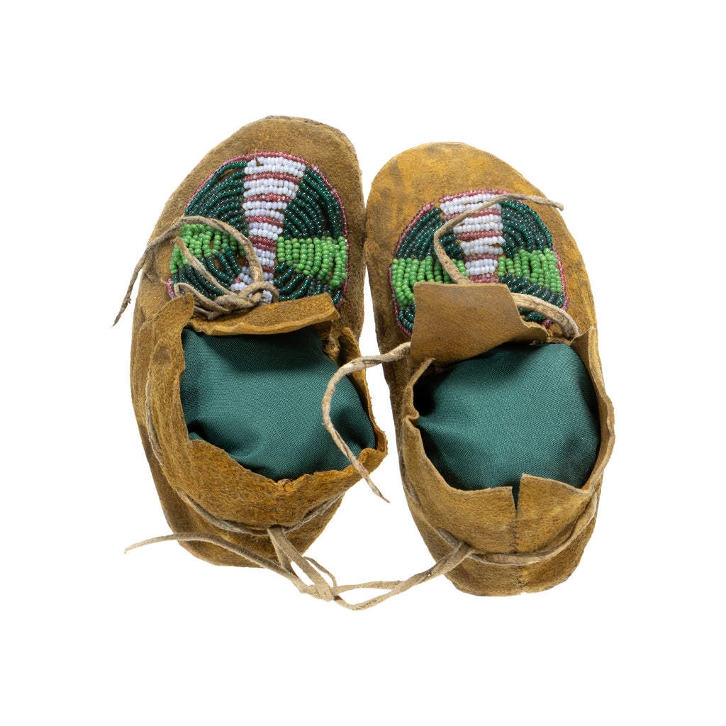 Mandan beaded baby moccasins with green circle. Parfleche soles. Smoke tanned antelope hide.