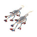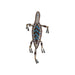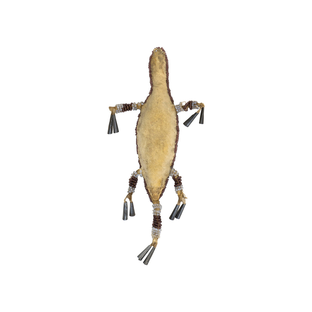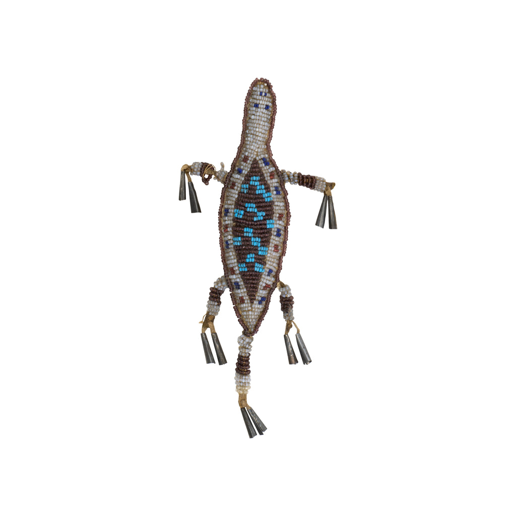 Matched pair fully beaded lizard fetishes. Geometric designs on opalescent background with brown edge beading. Double tin cones on feet and tail. 7"