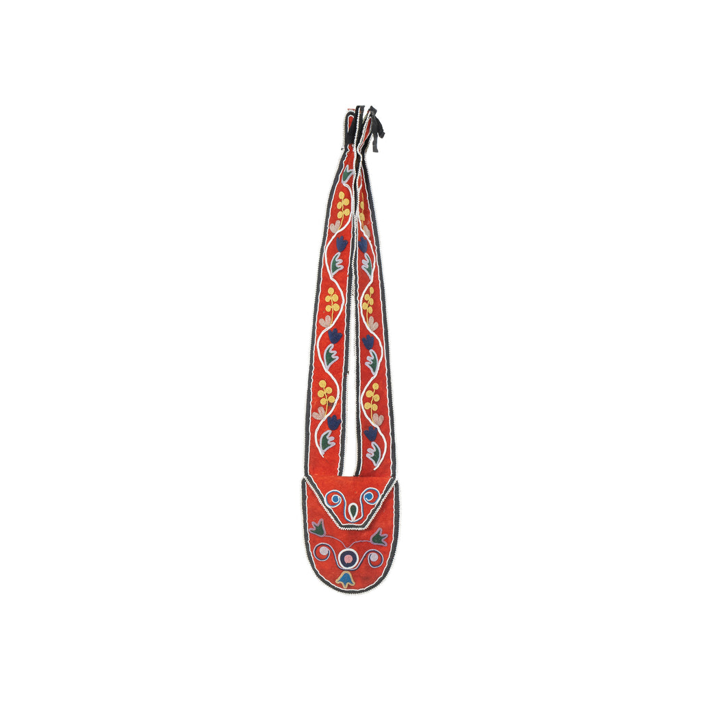 Metis Cree bandolier with classic beading on red stroud with white bead edging and black silk ribbon border.