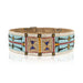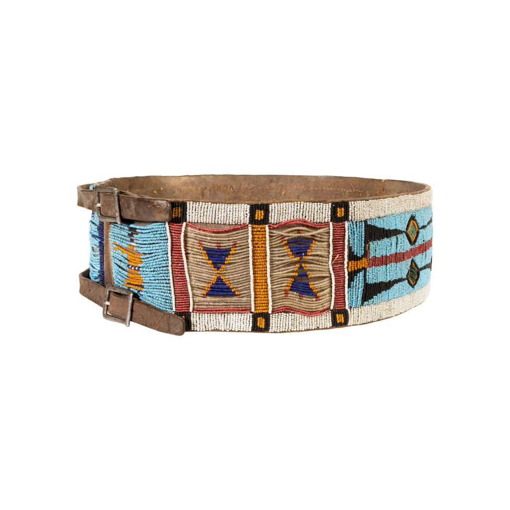 Plateau beaded figurative belt. Extra wide with double buckles. Horse dancer, hourglass and geometric motif.