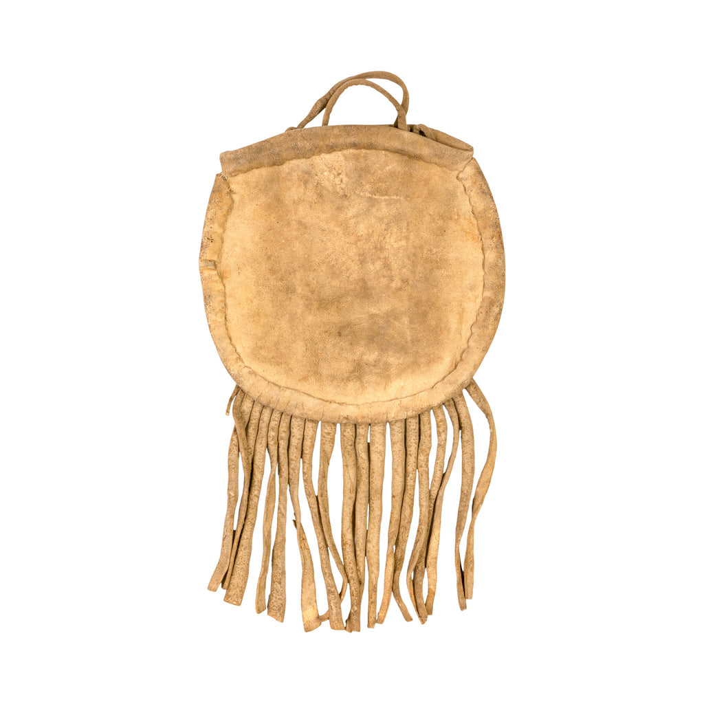 Plateau made fringed pouch of brain tanned elk hide with faceted beads, and flour sack lining. A few missing beads not distracting. Wihtout restoration. Collected in Coeur d'Alene.