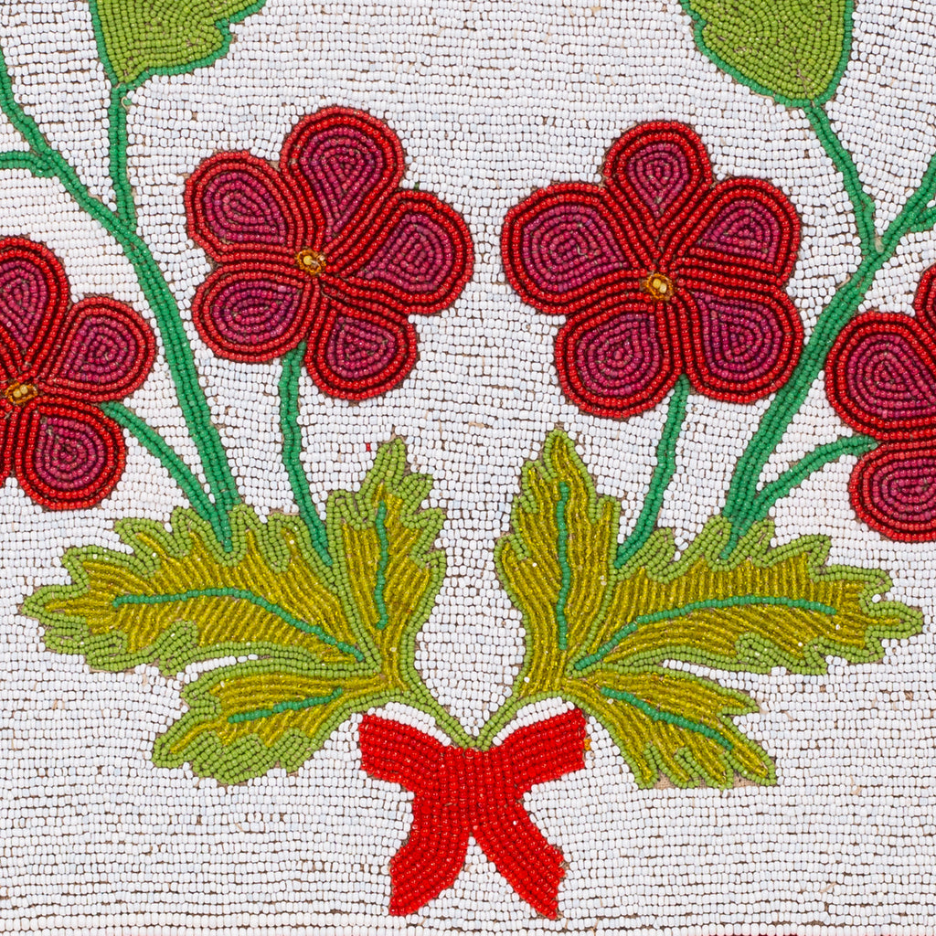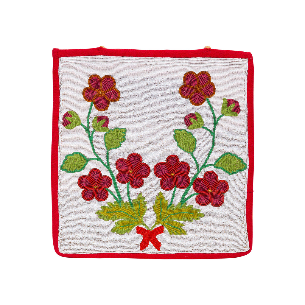 Fully beaded Plateau flat bag with floral design on white background. Red stroud edged and backed, flour sac lining. Interesting that there are three or four different sizes and types of white beads in the background. Ex. Blakeley. 11" x 12"