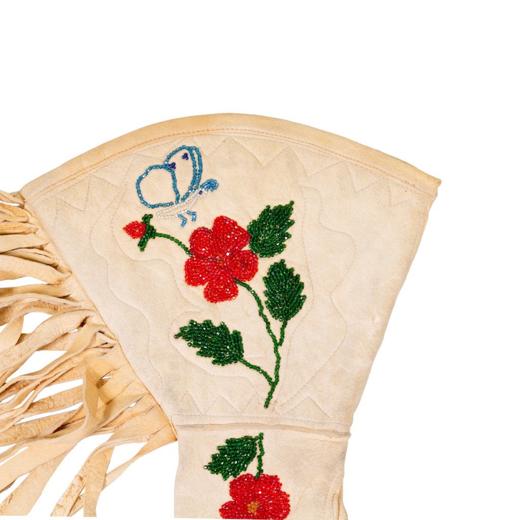 Plateau gauntlets of brain tanned doe skin. Partially beaded with floral design cuff with butterfly and glove. Machine sewn quilting on cuff. Faceted beads. The United States Cavalry riders wore gauntlet gloves as part of their uniform, introducing the clothing style to plains tribes who turned the gloves into spectacular works of art with painstaking beadwork. As skilled horsemen, Sioux and other plains tribes took great pride in their horses and often wore symbols that celebrated their warrior and rider status, such as these gauntlets. Western cowboys and rodeo performers adopted the beaded gauntlets made by Native People into their fancy wear.