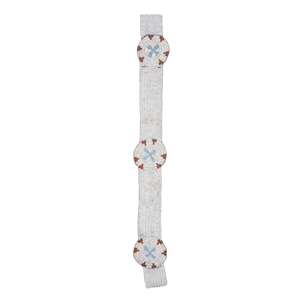 Shoshone/Ute blanket strip on buffalo hide. 58" with 7" rosettes 5" wide strip.