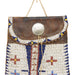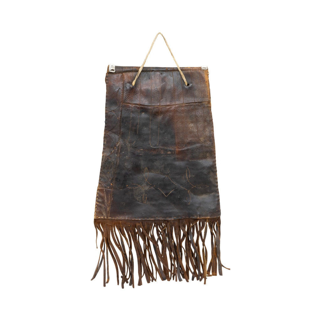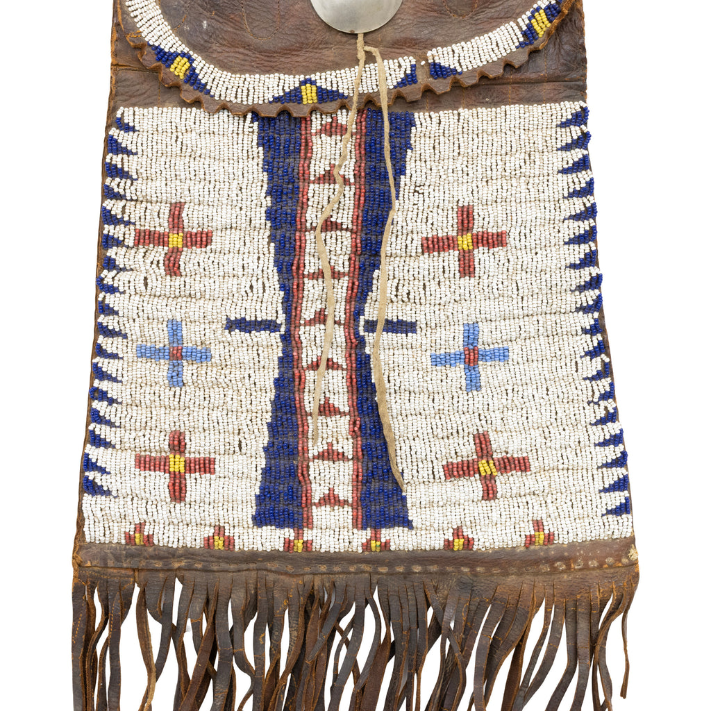 Sioux document pouch, made of boot leather. Classic beaded front with fringe and large German silver concho for closing. Red-white hearts and greasy yellows with cobalt blue on white background. 11 1/2" x 9 1/2" plus 4 1/2" fringe.