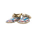 Sioux moccasins in the buffalo hoof style with yellow ochre buffers and thick buffalo hide soles. Beaded geometric designs exceptionally executed.
